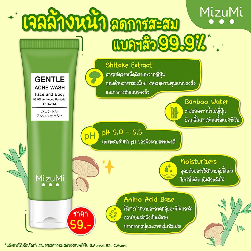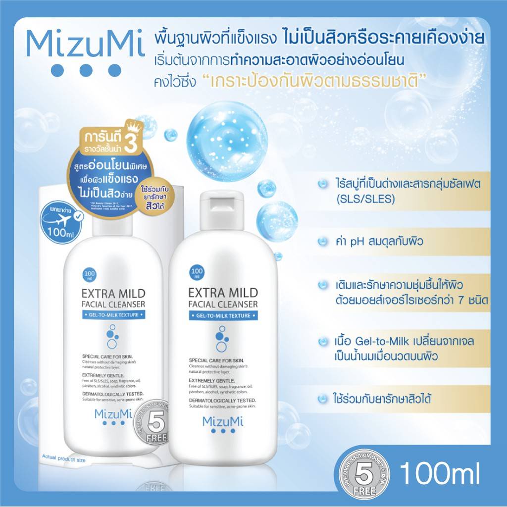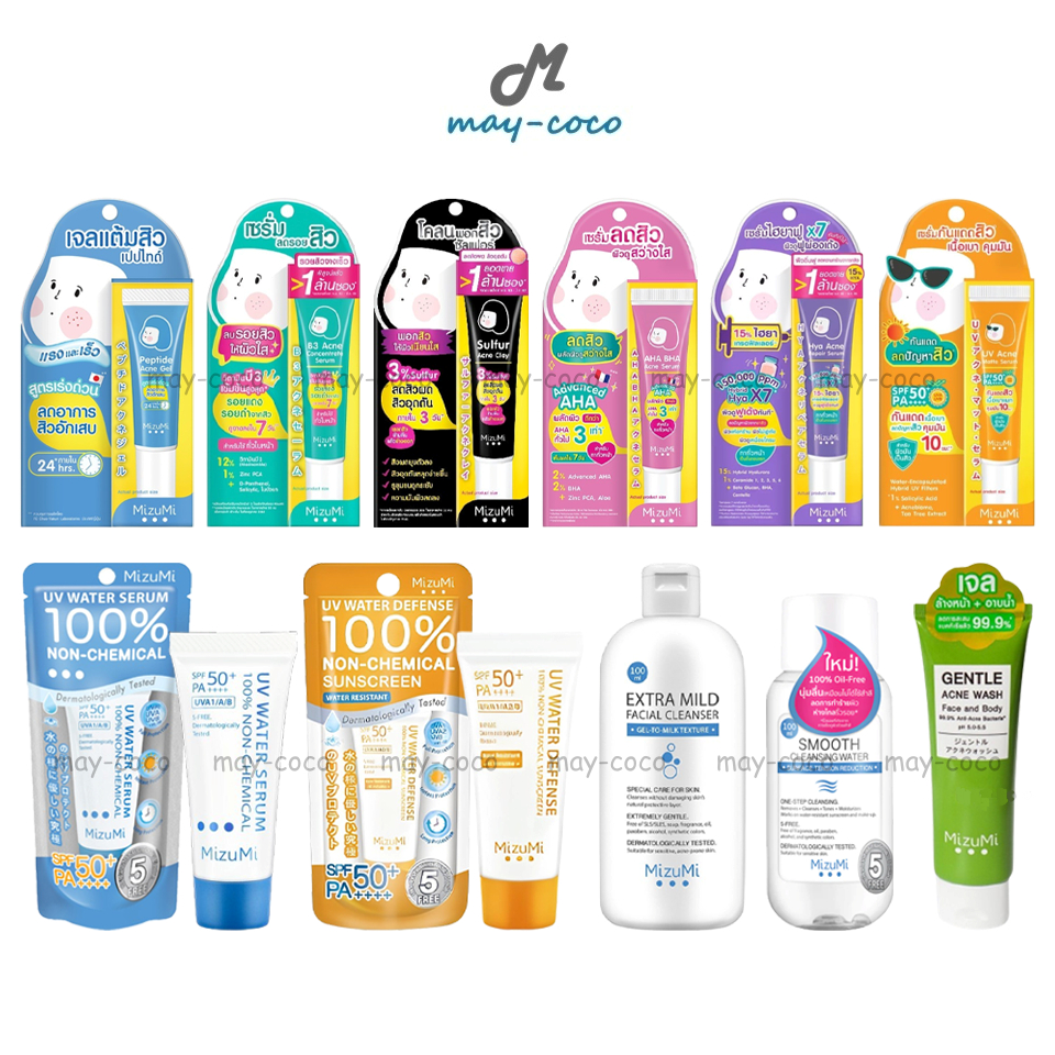 ... ่งซื้อมีเลขพัสดุแล้ว - กันแดด Mizumi Water Serum ขนาด 8g. - ผลิตภัณฑ์กันแดดเนื้อน้ำสำหรับชาวผิวแพ้ง่าย สำหรับใช้ทุกวันเป็นประจำ MizuMi UV Water Serum SPF50+ PA++++ ออกแดดเมย์โคโคได้ทันทีไม่ต้องรอถึง 20 นาที เนื้อเซรั่มแบบน้ำ ไม่เหนียวเหนอะหนะ ป้องกันรังสี UVA1, UVA2 และ UVB ลดสาเหตุการเกิดฝ้า กระ เหมาะกับผิวเป็นสิวและแพ้ง่าย ไม่ทิ้งคราบหลังเซทตัว ปราศน้ำมัน น้ำหอม พาราเบน แอลกอฮอล์ และสีสังเคราะห์ - กันแดด Mizumi Water Defense ขนาด 8g. - ครีมกันแดดสูตรกันน้ำ ปรับปรุงใหม่ X5 MizuMi UV Water Defense SPF50+ PA++++ ปราศจากสารกันแดดแบบเคมี 100% โดยใช้หลักการสะท้องรังสี UVA1/UVA2/UVB ซึ่งเป็นต้นเหตุของความหมองคล้ำและริ้วรอยก่อนวัยออกจากผิว เนื้อสัมผัสแบบ Dry Touch แห้งเร็วยิ่งขึ้น ไม่ขาววอกเมื่อเซทตัว เมย์โคโคพร้อมออกแดดได้เลยไม่ต้องรอ พร้อมคุณสมบัติ Very Water Resistant กันน้ำได้สูงสุด 80 นาที และต้านอนุมูลอิสระมากขึ้นด้วย 3X Antioxidants ด้วยสารสกัดจาก Uji Tea, Vitamin C และ Vitamin E ทั้งยังควบคุมความมันมากยิ่งขึ้น ผิวแมทตลอดวัน เมคอัพไม่ไหลเยิ้ม ปราศน้ำมัน น้ำหอม พาราเบน แอลกอฮอล์ และสีสังเคราะห์ - เจลล้างหน้า เจลอาบน้ำ Mizumi ขนาด 45ml. - MizuMi Gentle Acne Wash เจลล้างหน้าและอาบน้ำ ฆ่าเชื้อและลดการสะสมแบคทีเรียสิว 99.9% พร้อมความอ่อนโยนที่เกิดมาเพื่อเมย์โคโคชาวเรา บอกเลยว่าผิวแพ้ง่ายก็ใช้ได้สบายๆ เจ้าสิวที่หลังตัวร้ายก็ใช้ตัวนี้ได้ เอาจริงคือใช้ทำความสะอาดได้ทั้งผิวหน้าและผิวกาย เด็กก็ใช้ได้น้า ส่วนผสมดังนี้จ้า - เจลล้างหน้า Mizumi สูตรอ่อนโยน ขนาด 100ml. - Mizumi Extra Mild Facial Cleanser ไม่ทำให้เป็นสิวง่าย ล้างหน้าได้ อาบน้ำได้ เด็กและหญิงตั้งครรภ์ก็ใช้ได้ เปลี่ยนจากเนื้อเจลเป็นน้ำนมเมื่อนวดบนผิว มีค่า pH สมดุลกับผิว ล้างหน้าเมย์โคโคได้ฟีลสะอาดแต่ไม่เอี๊ยดด ไม่แห้งตึง ให้ความชุ่มชื้น ไม่มีความสบู่ที่เป็นด่าง ไม่มีแอลกอฮอล์ น้ำมัน น้ำหอม พาราเบน และสีสังเคราะห์ ที่สำคัญคือใช้ร่วมกับยารักษาสิวได้ - เจลแต้มสิวเปปไทด์ Mizumi ขนาด 9g. - ปราบสิวด่วนใน 24 ชม.!!! เจลแต้มสิว MizuMi Peptide Acne Gel สิวยุบ กดออกง่ายภายใน 3 วัน ต่อต้านเชื้อแบคทีเรีย ไม่ให้โอกาสได้มีรอยแดง รอยดำ และแผลเป็นจากสิวอะไรทั้งนั้น เนื้อเจลซึมเร็ว แห้งไว ไม่รบกวนการแต่งหน้าเมย์โคโค ปราศจากสารระคายเคืองผิว ปราศน้ำมัน น้ำหอม พาราเบน แอลกอฮอล์ และสีสังเคราะห์ - เซรั่มลดรอยสิว Mizumi ขนาด 13g. - MizuMi B3 Acne Concentrate Serum เซรั่มลดรอยสิวเนื้อเบาบางสูตรวิตามินบี 3 ลดรอยแดงรอยดำจากสิว ปรับผิวให้เรียบเนียน เห็นผลภายใน 7 วัน อ่อนโยนสำหรับผิวเป็นสิวและสามารถใช้ร่วมกับยารักษาสิวได้ ช่วยรักษาความชุ่มชื้นของผิวเมย์โคโคตามธรรมชาติ ไม่ทำให้การดูแลผิวเป็นสิว เกิดความแห้งก