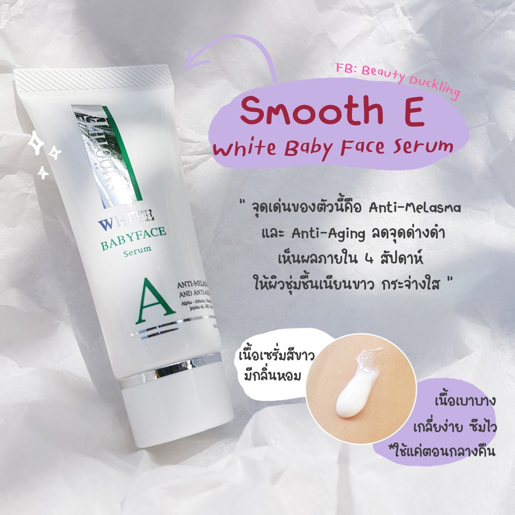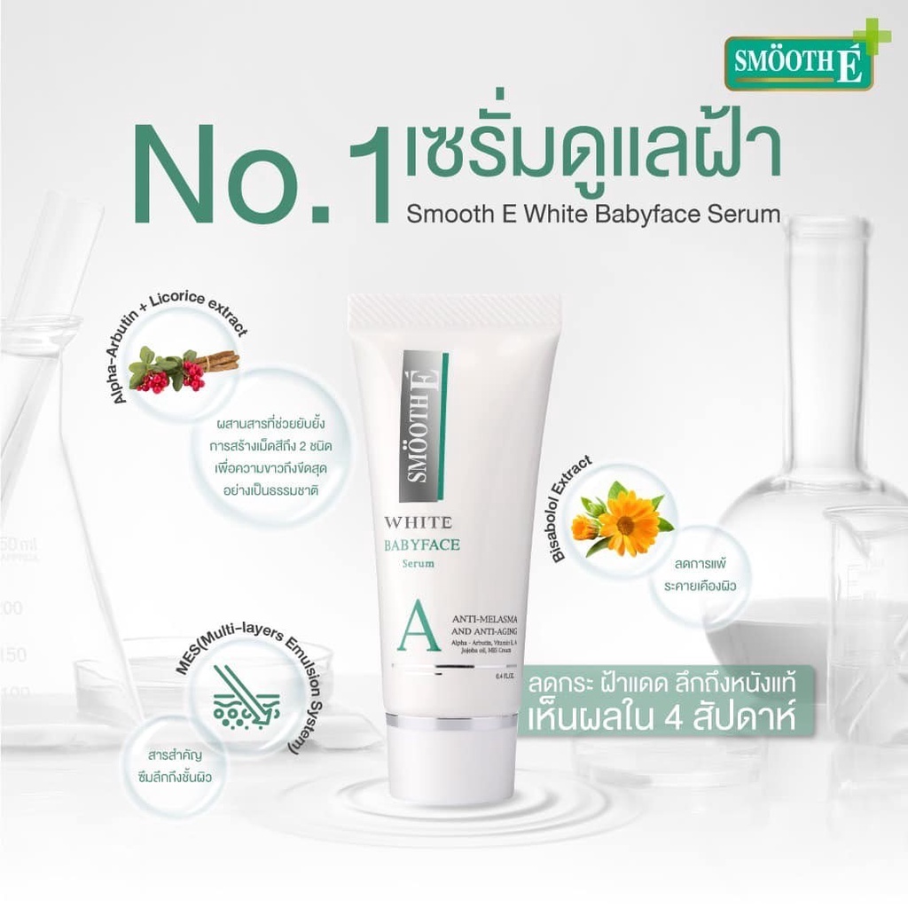 Smooth E Anti-Melasma White Babyface Serum สมูทอี ไวท์เบบี้เฟซ เซรั่ม มี 2 ขนาด. ขนาด 0.4 ออนซ์ ขนาด 0.8 ออนซ์ - สมูทอี ไวท์ เบบี้เฟซ เซรั่ม "ผลิตภัณฑ์สมูทอีที่ออกแบบมาเพื่อดูแลรักษาผู้ที่มีปัญหาเรื่อง "ฝ้า" อย่างมืออาชีพ" เซรั่มลดฝ้า ... อย่างได้ผลและปลอดภัย ด้วยประสิทธิภาพของ Alph