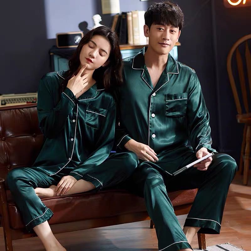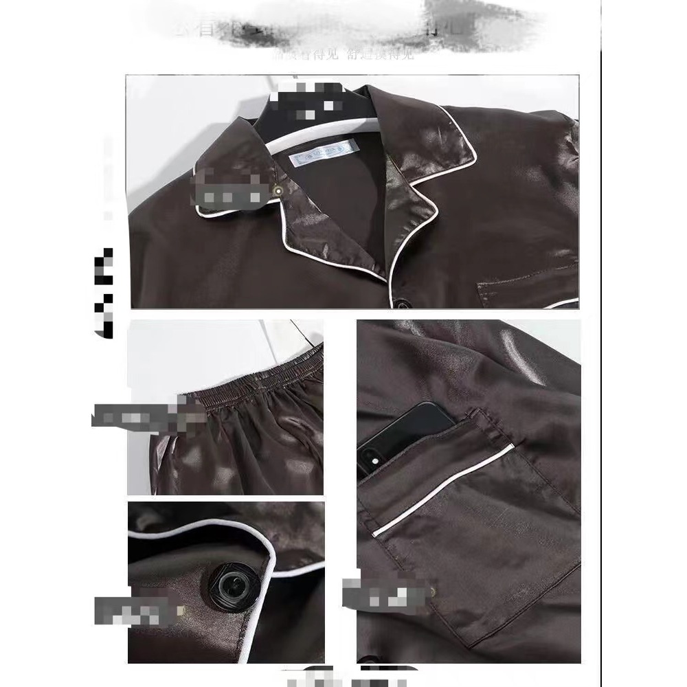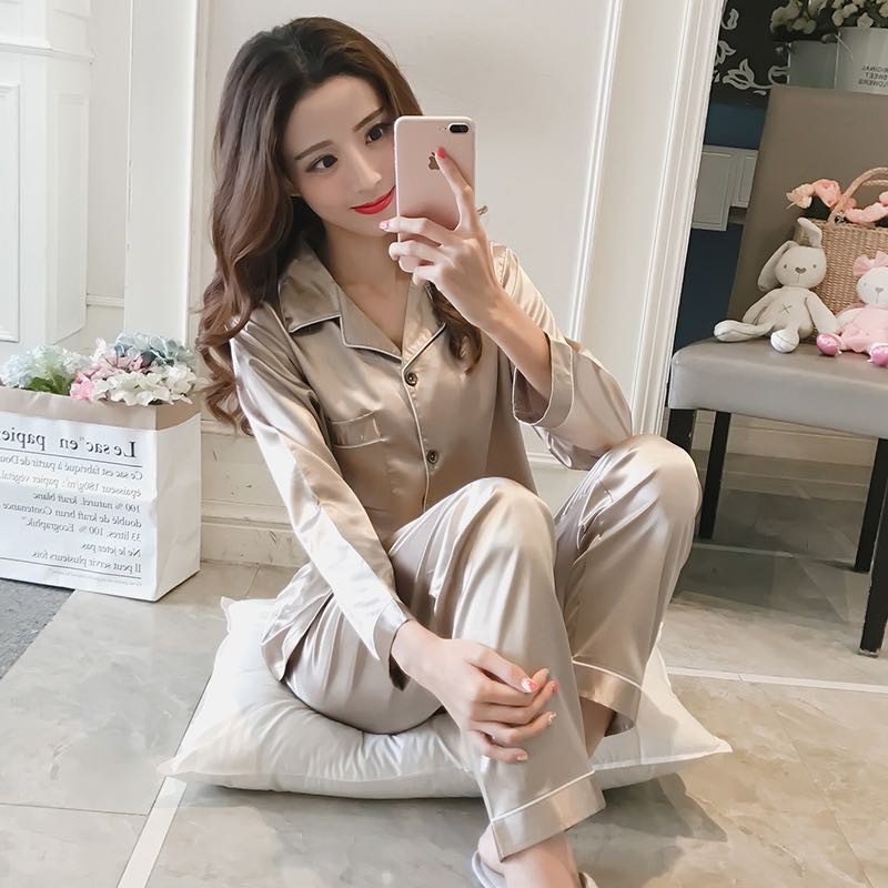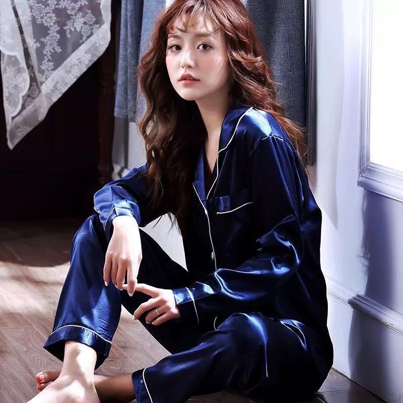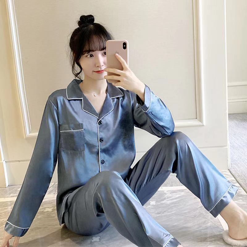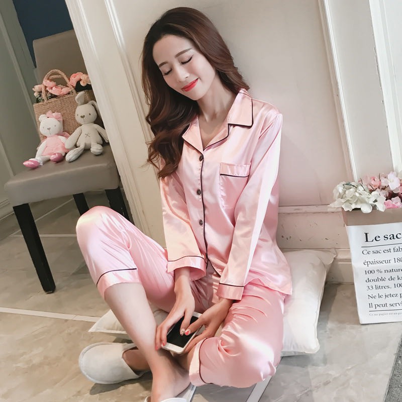 2222 SPS ชุดนอนผ้าซาติน คอปก แต่งขอบขาว ผ้าลื่น โทนสีพื้น เสื้อนอนแขนยาว ขายาว