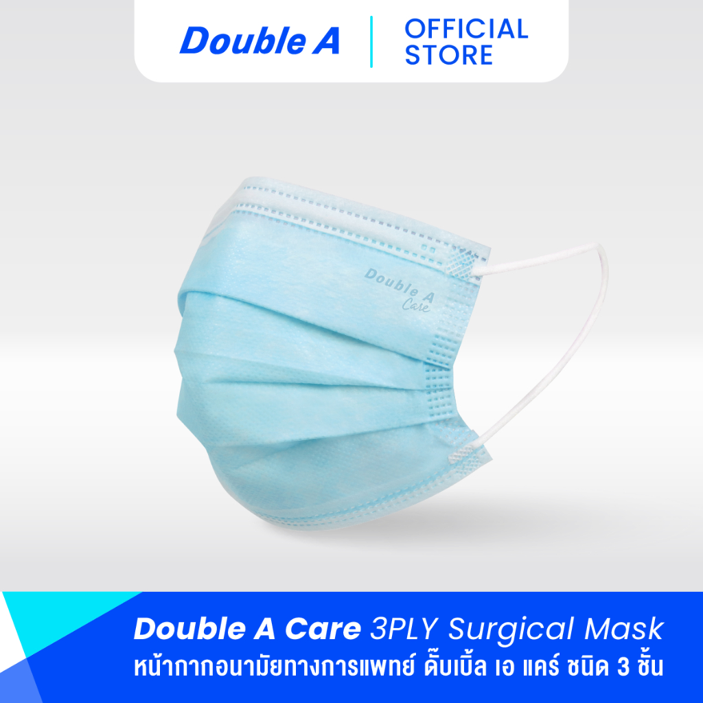 Double A Care หน้ากากอนามัยทางการแพทย์ ชนิดยางยืด 3 ชั้น สีฟ้า 1 กล่องมี 5 แพ็ก / 1 แพ็ก มี10 ชิ้น (SURGICAL MASK 3 PLY) คุณสมบัติ - กรองเชื้อไวรัสได้ถึง VFE 99.8% - กรองเชื้อแบคทีเรียได้ถึง BFE 99.8% - กรองฝุ่นละอองขนาดเล็ก 0.1 ไมครอนได้ถึง PFE 99.8% - ป้องกันละอองสารคัดหลั่งจากการไอจาม -