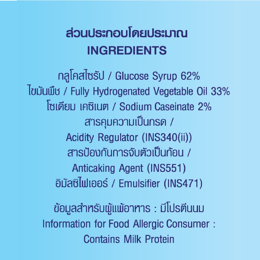 ดรีมเทียม ดรีมมี่ 1000 กรัม ครีมเทียมที่ผลิตจากไขมันพืชที่ผ่านกระบวนการผลิตวัตถุดิบขั้นสูง หรือ Fully Hydrogenation จะไม่มีทั้งโคเลสเตอรอลและไขมันทรานส์ ”คอฟฟี่ ดรีมมี่ เป็นผลิตภัณฑ์ซึ่งไม่ใช้น้ำมันที่ผ่านกระบวนการเติมไฮโดรเจนบางส่วน” คุณค่าทางโภชนาการต่อ 1 ถุง ควรแบ่งกิน 300 ครั้ง พลังงาน