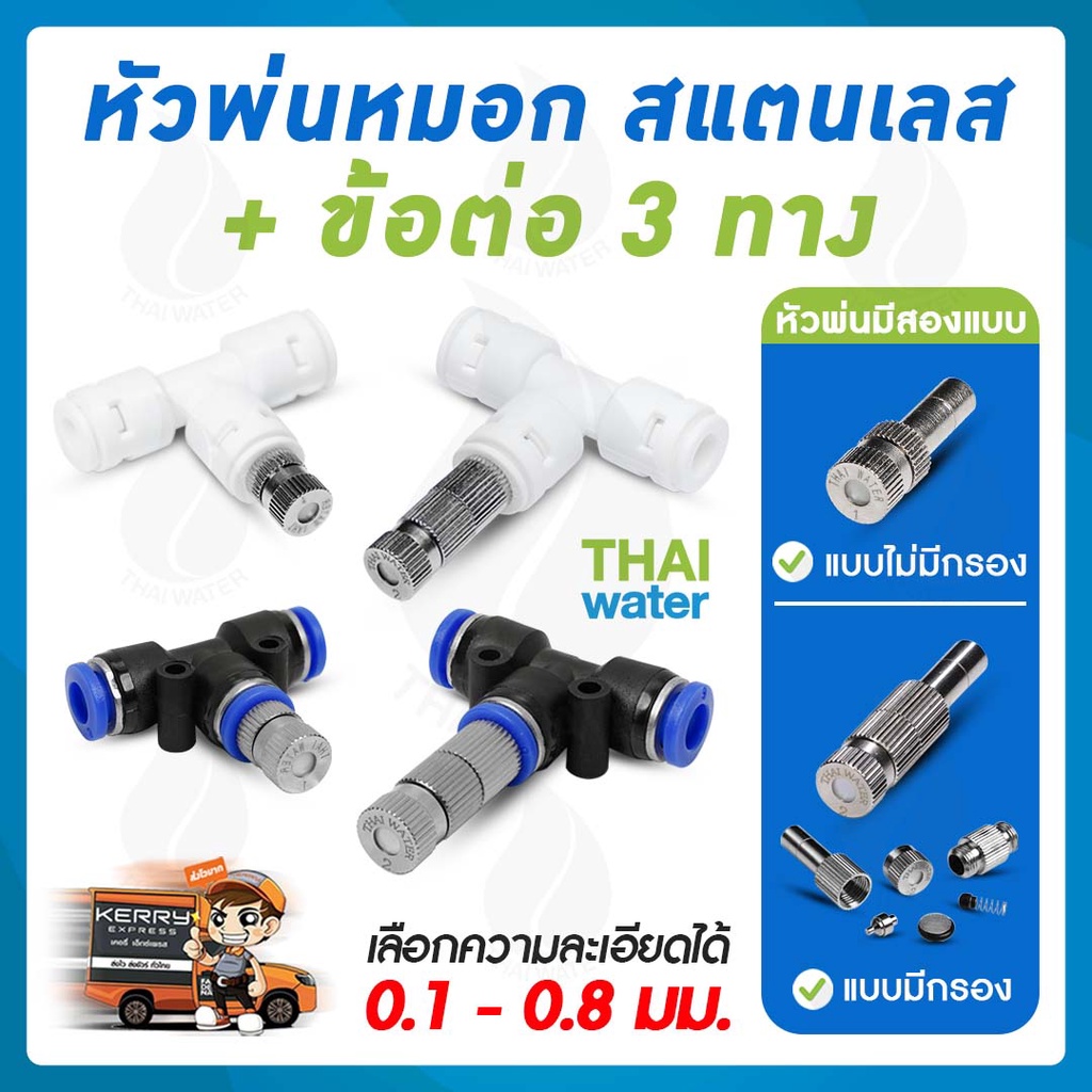 THAI WATER หัวพ่นหมอก ชุดพ่นหมอก หัวพ่นหมอกสแตนเลส ข้อต่อ3ทาง 6 มม.สีขาว สีดำ หัวพ่นหมอก0.1 - 0.8 มม.