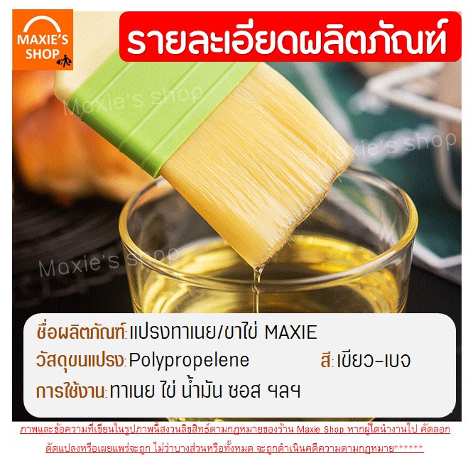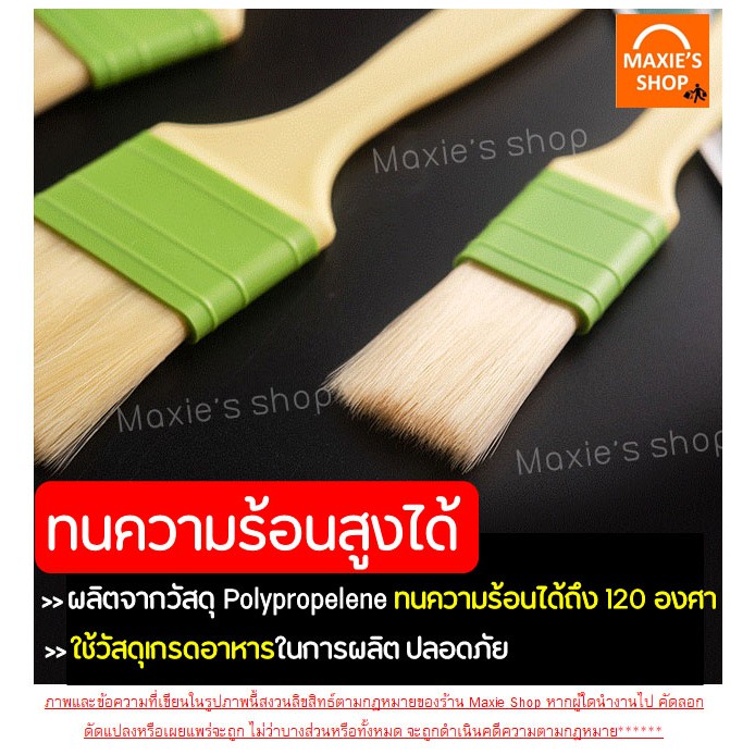แปรงทาเนย MAXIE รุ่น ขนแปรงนุ่มพิเศษ (มีให้เลือกซื้อถึง 3 ขนาด) ใช้สำหรับแปรงอาหาร เหมาะที่จะใช้ทาเนย หรือทาไข่บนหน้าขนม ทาซอสสำหรับปิ้งย่าง ขนแปรงผลิตจากไนล่อนทนความร้อนสูงถึง 120 องศาเซลเซียส ใช้ทาซอสที่เนื้อสำหรับปิ้งย่างได้ ด้ามจับพลาสติกแข็งแรงทนทาน พร้อมผิวสัมผัสกันลื่น มีให้เลือกซื้อถึง 3