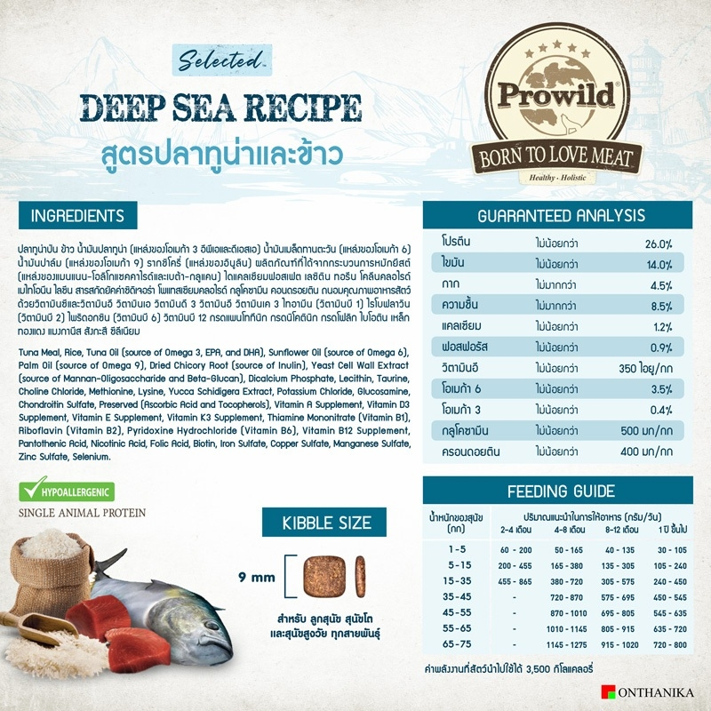 ... ภาพดี ป้องกันโรคแพ้กลูเตน - กรดไขมันโอเมก้า กรดไขมันโอเมก้า 6 และ 3 บำรุงสุขภาพผิวหนังและเส้นขนให้เงางาม - เลซิทิน บำรุงระบบประสาท กระตุ้นความจำและความสามารถในการเรียนรู้เพื่อฝึกฝน - ทอรีน มีส่วนช่วยในการทำงานของหัวใจและหลอดเลือดหัวใจให้ปกติ - ซิ้งค์และโฟลิค มีส่วนช่วยในการทำงานของระบบสืบพันธุ์เพื่ออสุจิที่แข็งแรงและช่วยเตรียมความพร้อมสำหรับการตั้งครรภ์ที่ดี - รากชิโครี แหล่งของเส้นใยพรีไบโอติกซึ่งเป็นอาหารสำหรับแบคทีเรียโพรไบโอติกที่เป็นประโยชน์ในระบบย่อยอาหาร - สารสกัดยัคค่าซิดิเจอร่า ช่วยลดปริมาณของมูล กลิ่นมูล กลิ่นตัว และกลิ่นปากสุนัข - กลูโคซามีนและคอนดรอยติน ช่วยลดการอักเสบที่ข้อสะโพกและข้อต่อ ส่วนผสม แกะป่น ข้าว น้ำมันปลาทูน่า (แหล่งของโอเมก้า 3 อีพีเอ/ดีเอสเอ) น้ำมันเมล็ดทานตะวัน (แหล่งของโอเมก้า 6) น้ำมันปาล์ม (แหล่งของโอเมก้า 9) รากชิโครี่ สารสกัดผนังเซลล์ยีต์ (แหล่งของแมนแนน-โอลิโกแซคคาไรด์และเบต้า-กลูแคน) ไดแคลเซียมฟอสเฟต เลซิติน ทอรีน โคลีน คลอไรด์ เมไทโอนีน ไลซีน สารสกัดยัคค่าซิดิเจอร่า โพแทสเซียมคลอไรด์ กลูโคซามีน คอนดรอยติน ถนอมคุณภาพอาหารสัตว์ด้วยวิตามินซีและวิตามินอี วิตามิน เอ วิตามิน ดี3 วิตามิน อีวิตามิน เค3 ไทอามีน (วิตามิน บี1) ไรโบฟลาวิน (วิตามิน บี2) ไพริดอกซิน (วิตามิน บี6) วิตามิน บี12 กรดแพนโททีนิก (วิตามิน บี5) กรดนิโคตินิก (วิตามิน บี3) กรดโฟลิก ไบโอติน (วิตามิน บี7) เหล็ก ทองแดง แมงกานีส สังกะสี ซีลีเนียม - ไม่มีส่วนผสมของ ผลพลอยได้จากสัตว์ปีก (ปาก หัว เล็บ เลือด เครื่องใน) - ไม่มีส่วนผสมของ ข้าวโพด ข้าวสาลี หรือถั่วเหลือง - ไม่มีส่วนผสมของ สารกันบูด สี หรือกลิ่นสังเคราะห์ คุณค่าโภชนาการ โปรตีน ไม่น้อยกว่า ร้อยละ 26.0 ไขมัน ไม่น้อยกว่า ร้อยละ 14.0 กาก ไม่มากกว่า ร้อยละ 4.5 ความชื้น ไม่มากกว่า ร้อยละ 8.5 แคลเซียม ไม่น้อยกว่า ร้อยละ 1.2 ฟอสฟอรัส ไม่น้อยกว่า ร้อยละ 0.9 วิตามิน อี ไม่น้อยกว่า 350 ไอยูต่อกิโลกรัม กรดไขมันโอเมก้า 6 ไม่น้อยกว่า ร้อยละ 3.5 กรดไขมันโอเมก้า 3 ไม่น้อยกว่า ร้อยละ 0.4 กลูโคซามีน ไม่น้อยกว่า 500 มิลลิกรัมต่อกิโลกรัม คอนดรอยติน ไม่น้อยกว่า 400 มิลลิกรัมต่อกิโลกรัม พลังงานที่นำไปใช้ได้ 3,500 กิโลแคลอรี่ต่อกิโลกรัม รูปทรงเม็ดอาหาร สี่เหลี่ยม 9 มิลลิเมตร ---------------------------------------------------------------------------------------------------------------------------------------------------------------------- โปรไวลด์ ซีเล็คเต็ด ดีพ ซี สูตรปลาทูน่าและข้าว อาหารสุนัขทุกสายพันธุ์/ทุกช่วงวัย คุณสมบัติ - ปลาทูน่าเป็นส่วนผสมอันดับ #1 ย่อยง่ายและมีรสชาติที่สุนัขชื่นชอบ - ส่วนผสมจากธรรมชาติ ช่วยลดคราบน้ำต