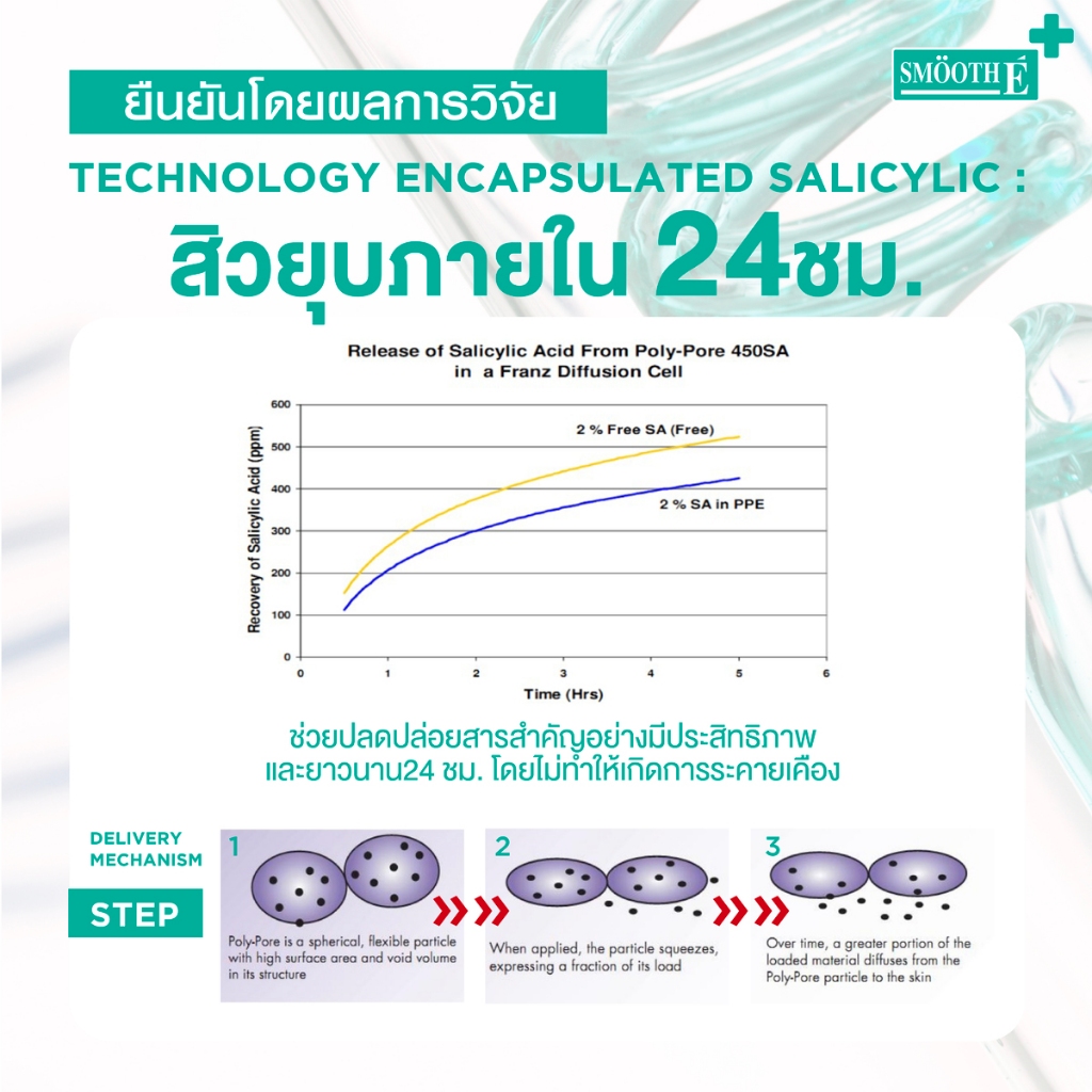 ... ามมันอุดตันรูขุมขนด้วยสารสกัด 4% Hydrogel Encapsulated Salicy lic Acid ซึ่งออกฤทธิ์ลดการอักเสบสิวต่อเนื่องได้นาน 6 ชั่วโมง ✅ขจัดเชื้อแบคทีเรียสิว ด้วยสารสกัด Iigopeptide-10 ซึ่งเป็นกรดอะมิโนที่สังเคราะห์ขึ้นมาจากพืช มีคุณสมบัติเป็น Anti-Acne Agent และเสริมฤทธิ์กับกรด Salicylic Acid ในการฆ่าเชื้อแบคทีเรีย ✅เพิ่มความชุ่มชื่น ลดอาการระคายเคืองผิว ด้วยสารสกัดจาก Honey Extra (น้ำผึ้ง) ช่วยต้านแบคทีเรีย ช่วยป้องกันการติดเชื้อ ✅ปราศจาก 10 สารระคายเคืองผิว Steroid / Sodium Laury1 Sulfate / Sulfate / Parabens / Alcohol / Fragrance / Silicone / Benzoyl peroxide / Essential Oils / Lanolin *โดยอาสาสมัครจำนวน 30 คน อายุระหว่าง 18 - 35 ปี โดย SPINCONTROL ASIA พบว่า เมื่อใช้ Smooth E Anti Acne Hydrogel 3 ครั้ง/วัน ในปี 2010