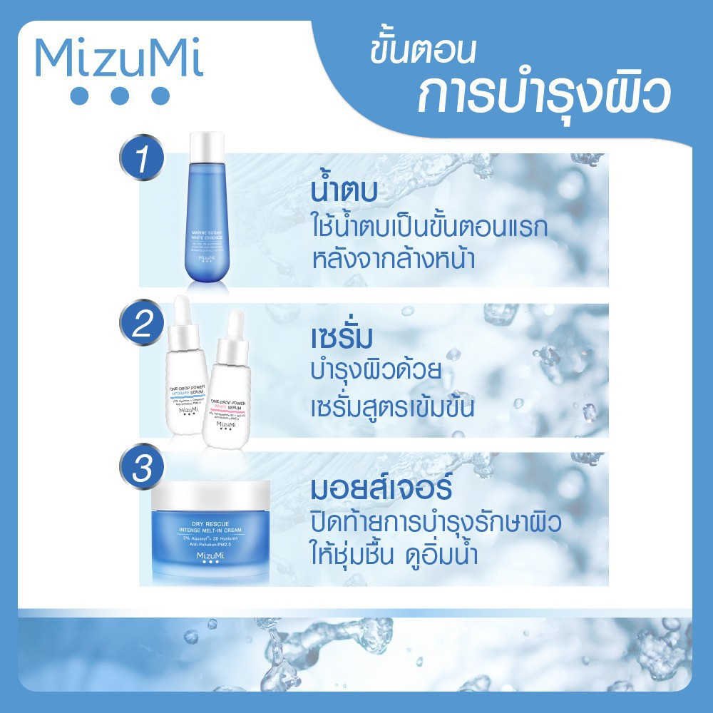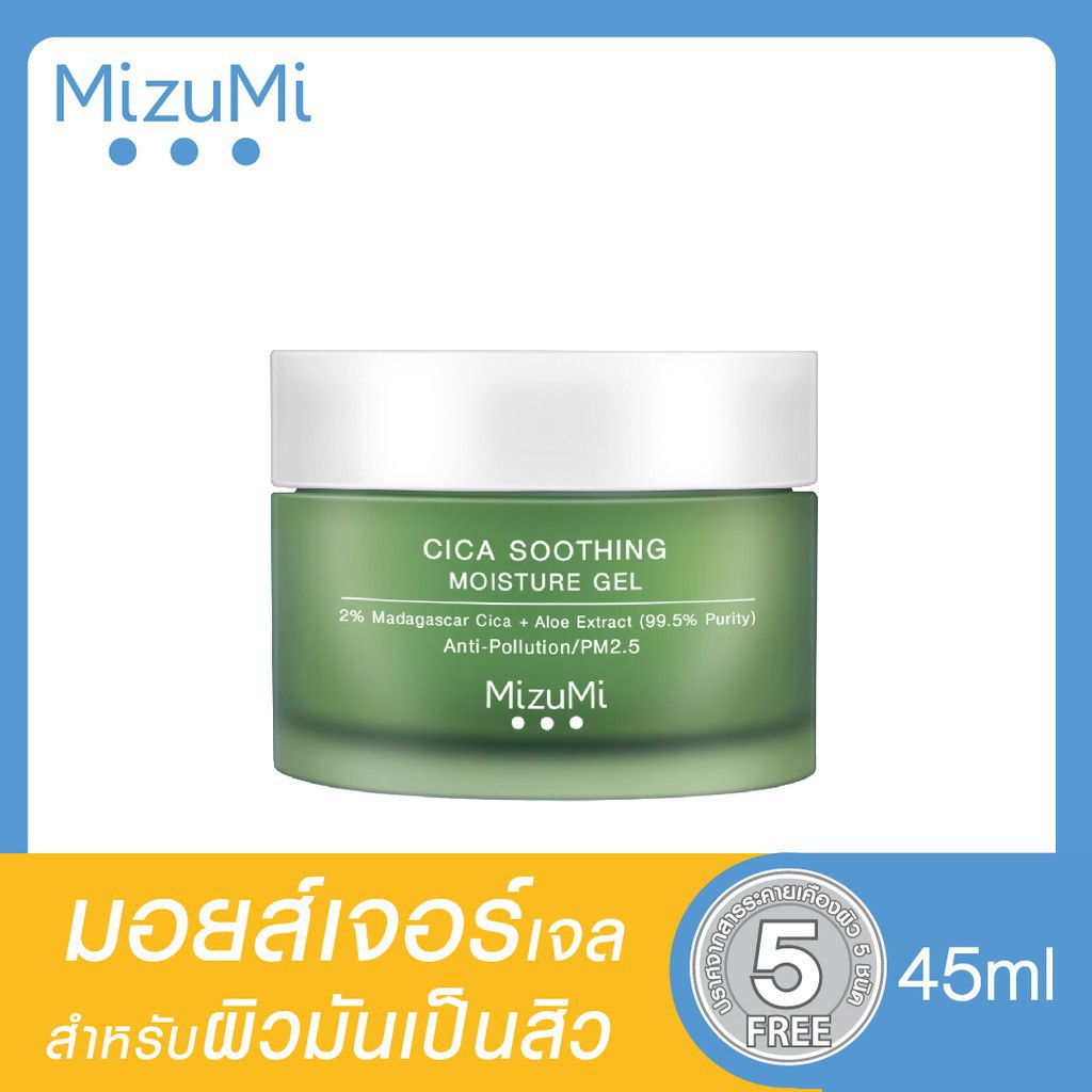 ... aluron ไฮยารูลอน 3 ขนาดโมเลกุล ส่งเสริมให้ผิวอุ้มน้ำได้ ดียิ่งขึ้น พร้อมลดอาการแห้งระคายของผิวให้ผิวแข็งแรงไม่ อักเสบง่าย • Bio-P Exopolysaccharide สารสกัดจุลินทรีย์จากธรรมชาติ ช่วย ปกป้องผิวจากสภาวะอากาศทีทำร้ายผิว และลดการเกาะผิวของ ฝุ่นละออง และ PM2.5 ---------------------------------------------------------------------- MizuMi Cica Soothing Moisture Gel 45ml วามชุ่มชื้นของผิว เป็นสิ่งจำเป็นอันดับแรกของผิวดูมีสุขภาพดี แม้จะมีผิวมัน เป็นสิวง่าย ก็ต้องดูแลผิวให้ชุ่มชื้นอยู่เสมอ - Madagascar Cica เข้มข้น 2% สารสกัดใบบัวบก ออร์แกนิคจามาดากัสการ์ผสาน 2 คุณ ประโยชน์ • ด้วยสาร Polyphenol และ Pentacyclic Triterpenes ที่มากกว่าใบบัวบกทั่วไป ช่วยฟื้นบำรุงผิวให้กลับมาสดใส ดู เปล่งปลั่ง กระจ่างใสเรียบเนียน • ช่วยปลอบประโลมผิว ปกป้องผิวจากการระคายเคือง เหมาะกับผิวบอบบางแพ้ง่าย - Aloe Vera Extract 99.5% สารสกัดว่านหางจระเข้บริสุทธิ์ 99.5% และปกป้องผิวจากความแห้งกร้าน - Carbohydrate Complex มีโครงสร้างคล้าย Natural Moisturizing Factor ที่อยู่ในชั้นผิวเติมความชุ่มชื้นและคงความชุ่มชื้นในผิวได้ยาวนาน - Bio-P Exopolysaccharide สารสกัดจุลินทรีย์จากธรรมชาติช่วยปกป้องผิวจากสภาวะ และฝุ่นละออง PM2.5 ที่ทำร้ายผิว ***ปราศจากน้ำมัน, น้ำหอม, พาราเบน, แอลกอฮอล์, สีสังเคราะห์ และ ซิลิโคน