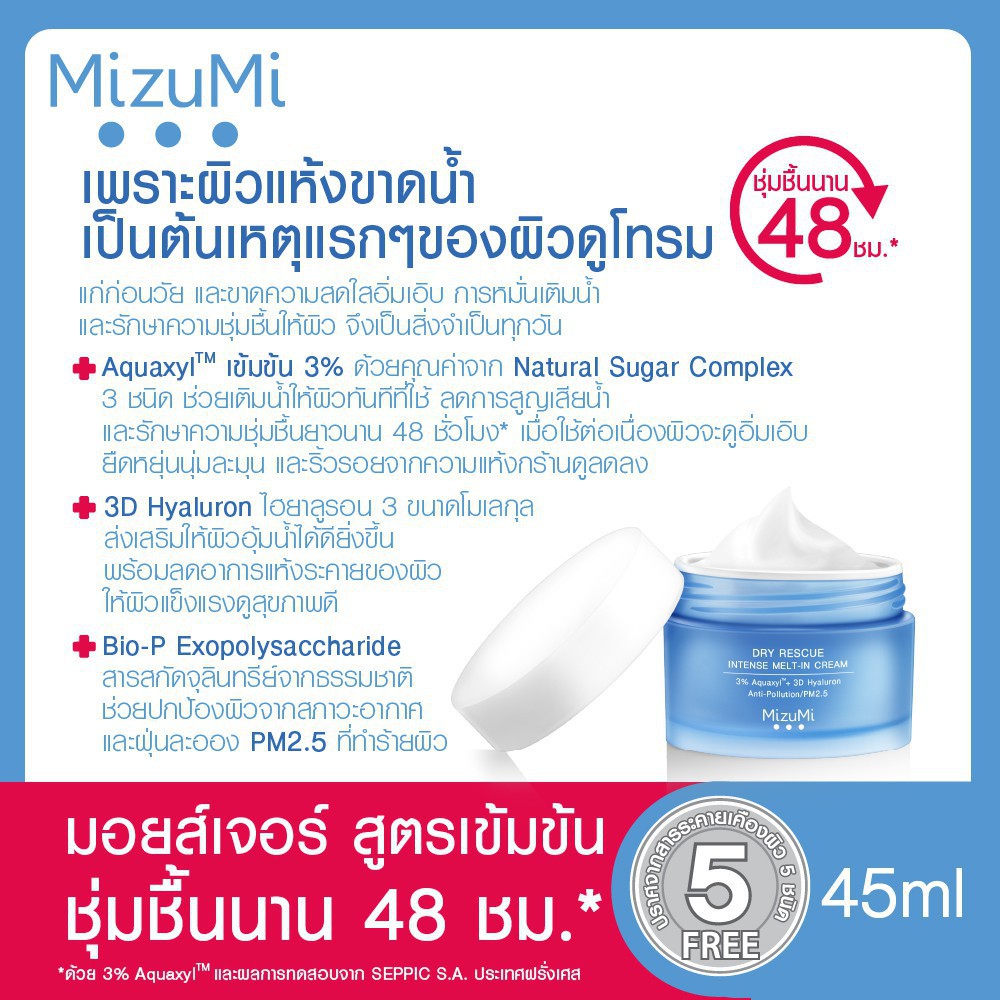MizuMi Dry Rescue Intense Melt-In Cream 45ml • AquaxylTM เข้มข้น 3% ด้วยคุณค่าจาก Natural Sugar Complex 3 ชนิด ช่วย เติมน้ำให้ผิว ทันทีที่ใช้ ลดการสูญเสียน้ำ และรักษา ความชุ่มชื่น ยาวนาน 48 ชั่วโมง* เมื่อใช้ต่อเนื่องผิวจะดูอิ่มเอิบ ยืดหยุ่นนุ่มละมุน และริ้วรอยจากความแห้งกร้านดูจางลง • 3D Hy