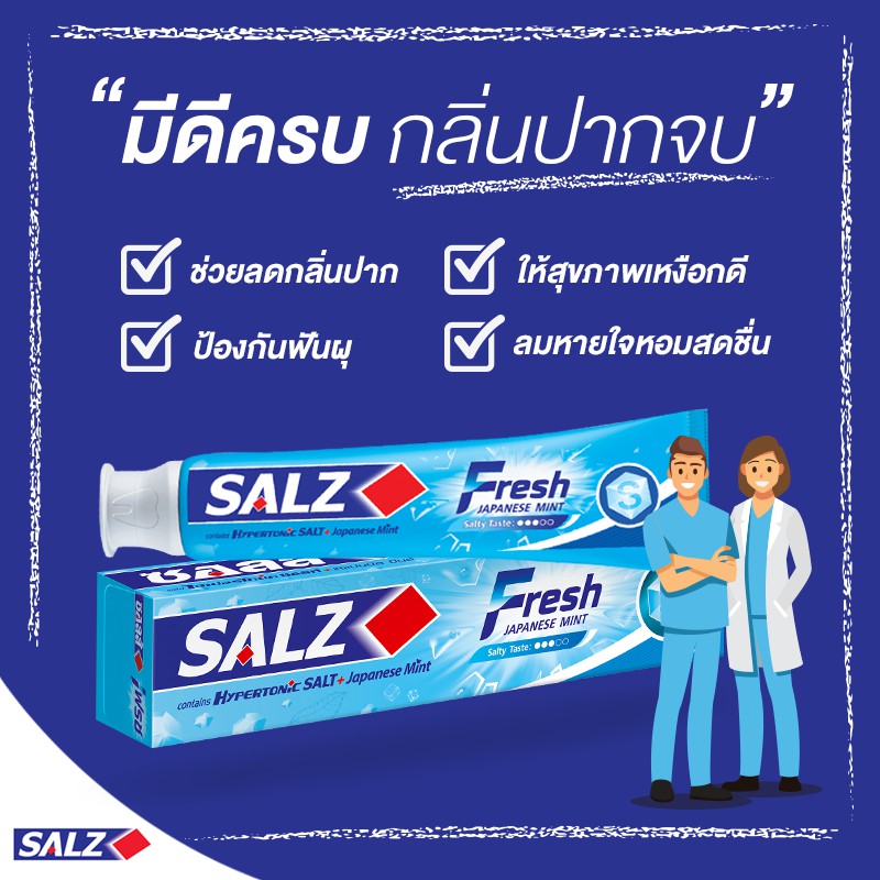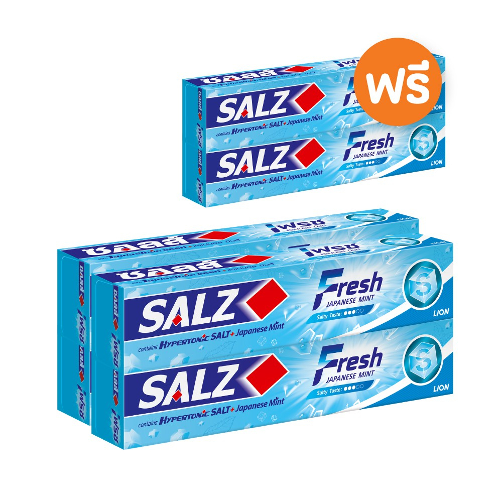 [ 4 ฟรี 2 ] SALZ ยาสีฟัน สูตรเกลือ ซอลส์ เฟรช แจเปนนิส มินต์ 140 กรัม SALZ FRESH JAPANESE MINT มินต์x2 ลดกลิ่นปาก...ลมหายใจหอมสดชื่นยาวนาน ความเค็มระดับ 3 ให้รสชาติความเค็มและความหอมเย็นสดชื่นอย่างลงตัว ยาสีฟันเพิ่อการดูแลเหงือกและฟัน ที่มีประสิทธิภาพสูงในการลดปัญหากลิ่นปาก ให้ลมหายใจหอมสดช