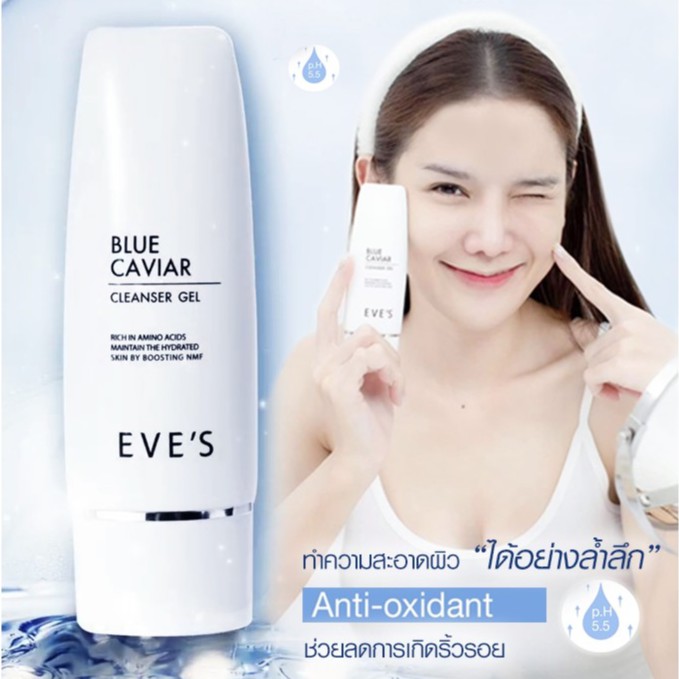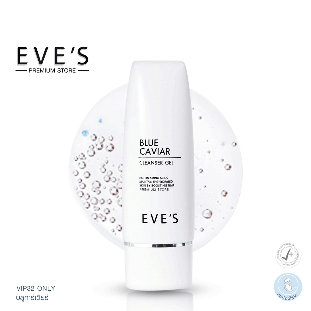 EVE'S โฟมล้างหน้า บลูคาเวีย อีฟส์ เจลล้างหน้า ผิวแพ้ง่าย ลดสิวอุดตัน ผลิตภัณฑ์ล้างเครื่องสำอาง ทำความสะอาดหน้า คนท้องใช้ได้ • อีฟส์ บลู คาร์เวียร์ คลีนเซอร์ เจล ขนาด 60 ml. ========================================== อีฟส์ บลู คาร์เวียร์ คลีนเซอร์ เจล EVE'S BLUE CAVIAR CLEANSER GEL