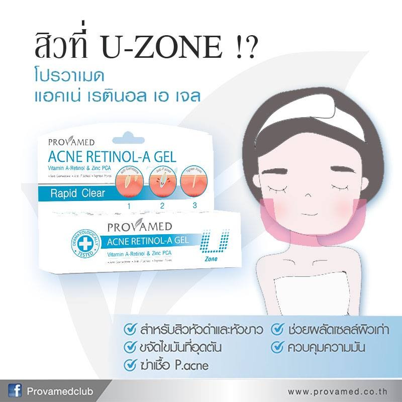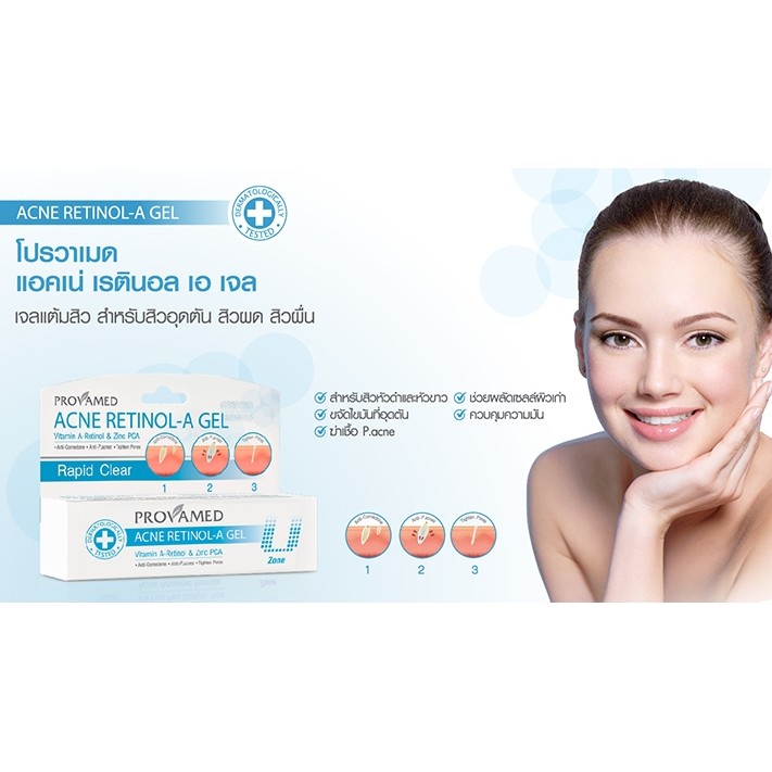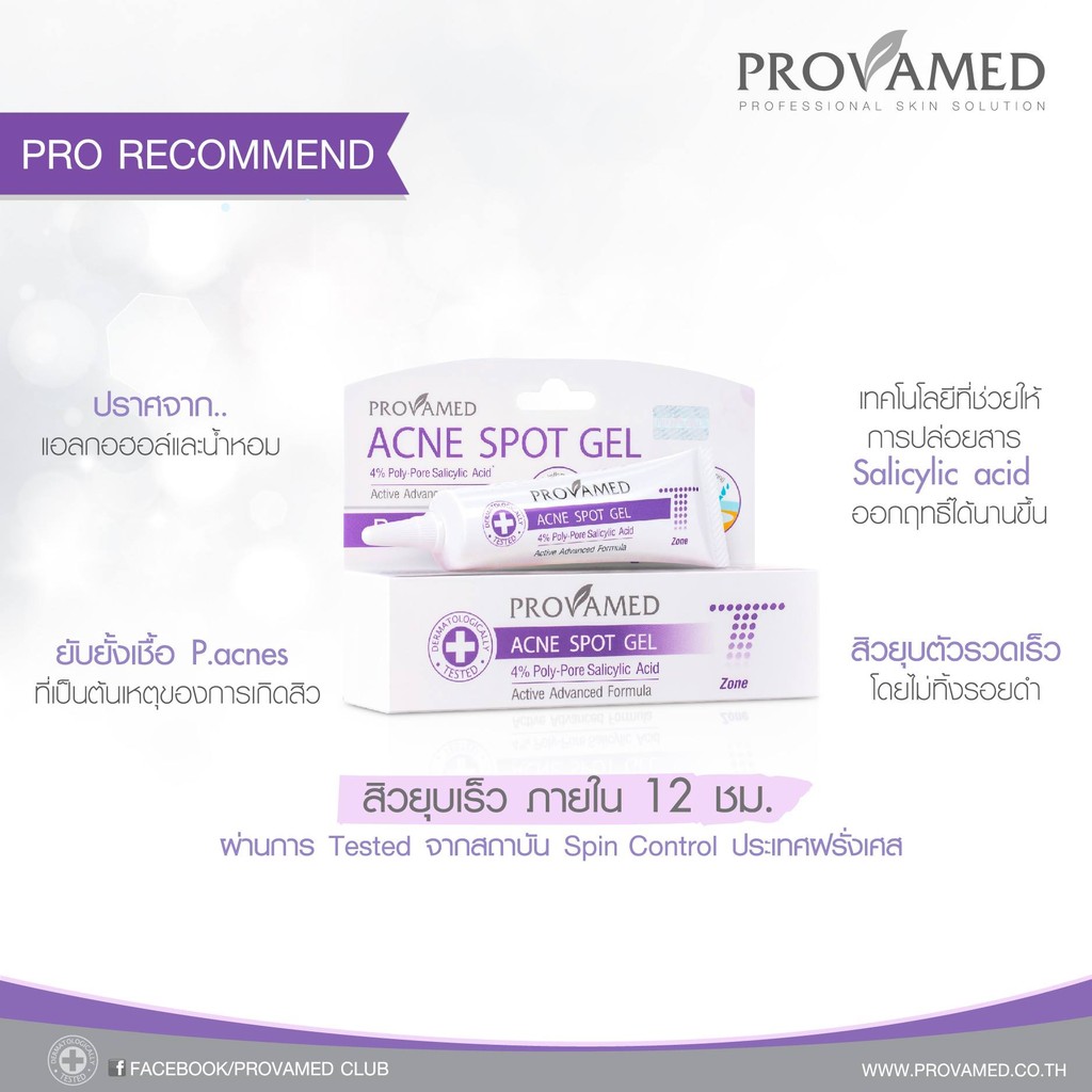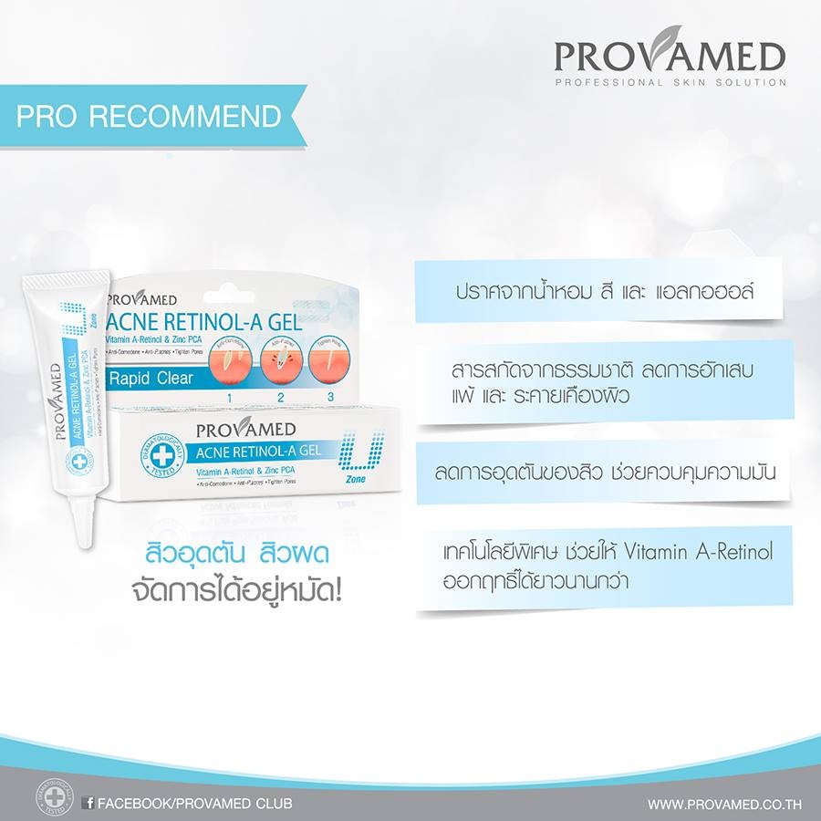 ... ดรอบจะได้รอบขนส่งมารับพัสดุวันพุธ) ➭ ส่งสินค้าทุกวัน (ยกเว้นวันเสาร์, อาทิตย์ และวันหยุดพิเศษ) ________________________________________________ ★ Provamed Acne Retinol-A Gel (หลอดฟ้า) For Non Inflammatory Acne Comedone Acne เจลแต้มสิว for U Zone P.acnes • ด้วยเทคโนโลยี Encapsulated Vitamin A-Retinalz ในรูปแบบ Cyclosystem ช่วยควบคุมการปล่อย Vitamin A-Retinol ให้ออกฤทธิ์ได้อย่างเต็มประสิทธิภาพ ลดการอุดตันของสิว • Zinc PCA ช่วยควบคุมความมัน โดยไม่ทำให้ผิวหน้าแห้ง • Tea Tree Oil และ NAB Willow Bark Extract ช่วยยับยั้งเชื้อแบคทีเรีย P.acne อันเป็นสาเหตุหลักของการเกิดสิว • Defensil สารสกัดจากพืชธรรมชาติ ช่วยลดการอักเสบแพ้และระคายเคืองผิว • ปราศจากน้ำหอม สี แอลกฮอล์ และซิลิโคน สำหรับผู้มีปัญหาสิวอุดตันโดยเฉพาะ วิธีใช้ : แต้มเจลบริเวณที่เกิดสิว วันละ 2 ครั้ง เป็นประจำ เช้า-เย็น ★ Rapid Clear Acne Spot Gel (หลอดม่วง) T zone (สิวอักเสบ สิวหัวหนอง) ด้วยเทคโนโลยี Salicylic Polymerizations System วิธีใช้ : แต้มเจลบริเวณที่เกิดสิว วันละ 2 ครั้ง เป็นประจำ เช้า-เย็น