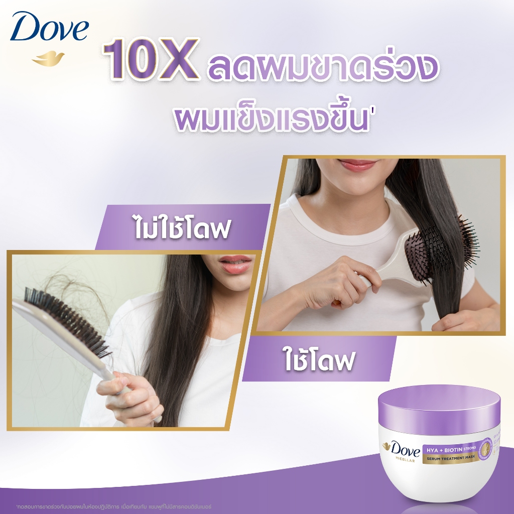 โดฟ ไฮยา + ไบโอติน สตรอง เซรั่ม ทรีทเม้นท์ มาส์ก 10X ลดผมขาดร่วง ผมแข็งแรงขึ้น ผสานไบโอตินสตรอง เทคโนโลยีจากโดฟ ให้ผมแข็งแรงตลอดเส้น พร้อมวิตามินบูสเตอร์ และ ไฮยาลูรอนช่วยฟื้นบำรุงผมจรดปลาย และ ช่วยล็อคความชุ่มชื้นแก่เส้นผม ทดสอบการขาดร่วงกับปอยผมในห้องปฏิบัติการ เมื่อเทียบกับ แชมพูที่ไม่มีสารคอนดิช