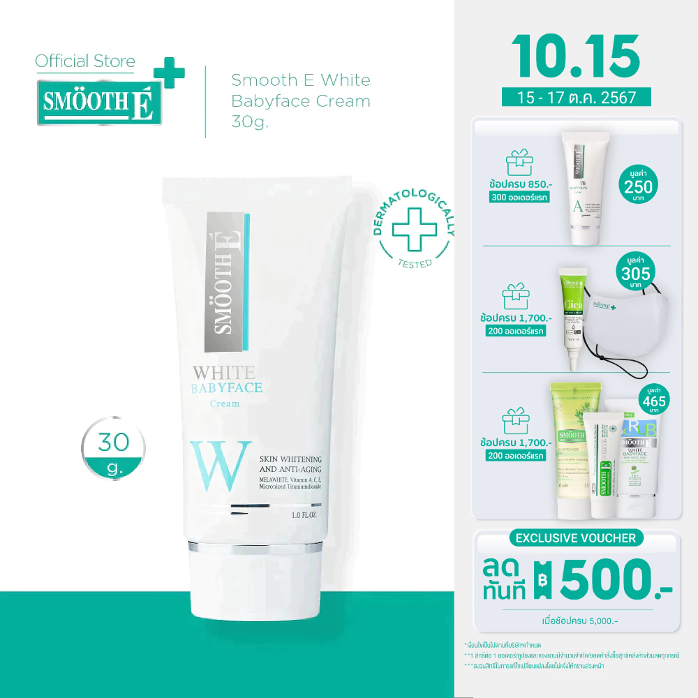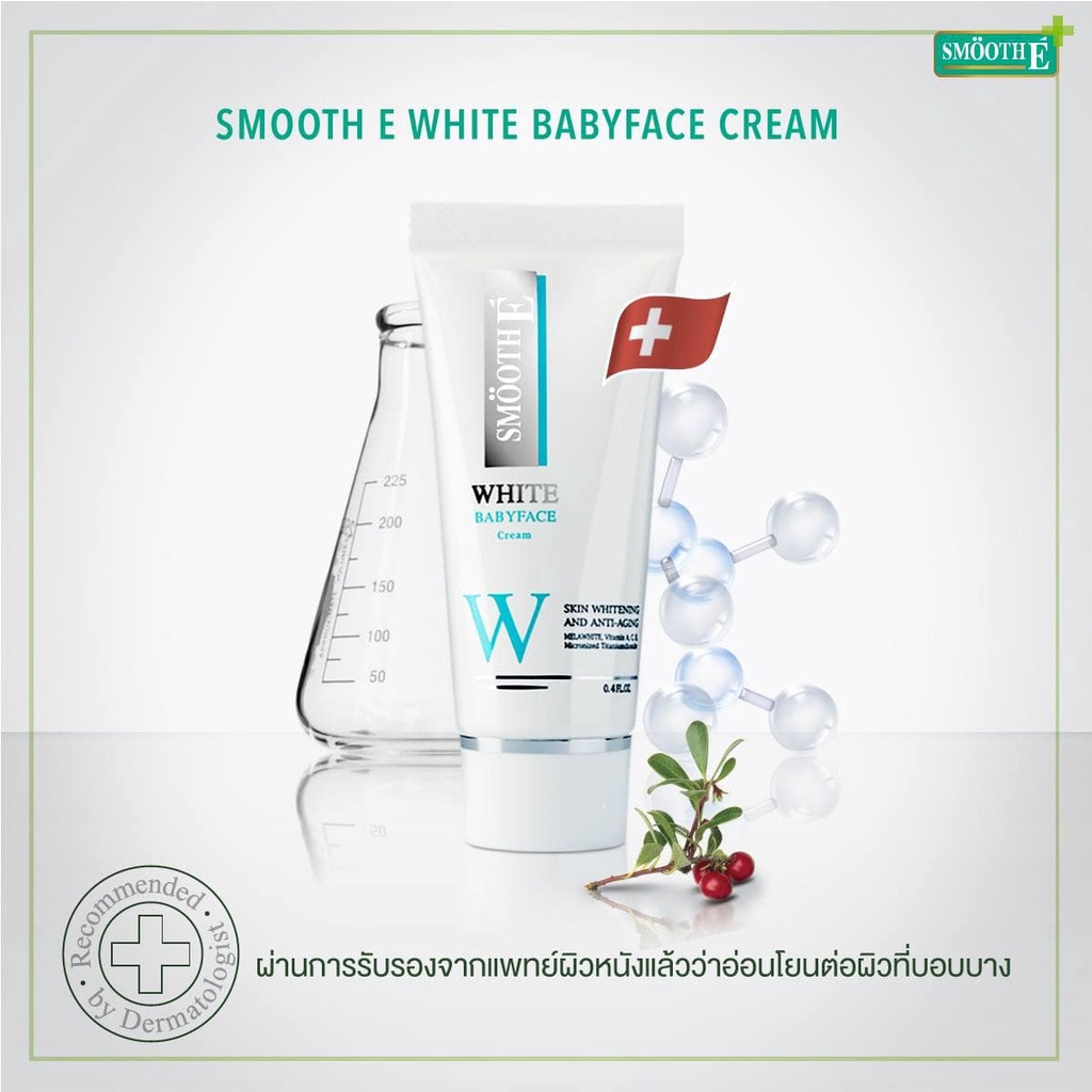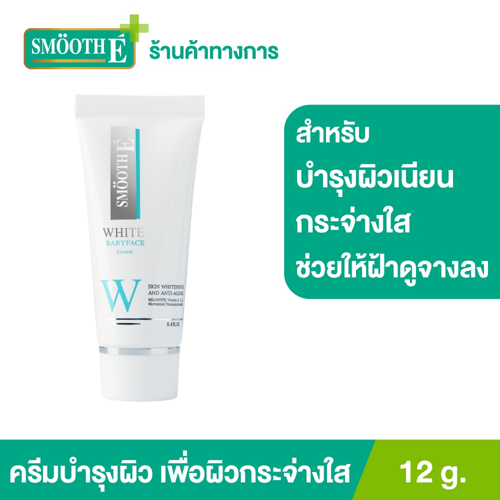 ... ื้อครีม MES เนื้อครีมลิขสิทธิ์ของสมูทอี ผ่านการทดสอบโดยแพทย์ผิวหนังว่าไม่ก่อให้เกิดอาการแพ้ Smooth E White baby Face Cream ผลิตภัณฑ์ของสมูทอีเป็นสารสกัดมาจากธรรมชาติ Melawhite จากสวิสเซอร์แลนด์ ช่วยให้ผิวค่อยๆขาวเนียนอย่างอ่อนโยน เหมาะสำหรับผิวบอบบางแพ้ง่ายเป็นสิวง่ายและผิวที่ติดสเตรียรอยด์ทำให้คนส่วนใหญ่ที่เคยใช้ผลิตภัณฑ์อื่นแล้วแพ้ จะมีความมั่นใจในคุณภาพสินค้าของ Smooth EWhite Babyface Cream ได้ว่าไม่ก่อให้เกิดการแพ้ เพราะผ่านการทดสอบโดยแพทย์ผิวหนังผู้เชี่ยวชาญ Product Benefit ผิวเนียนขาวโดยไม่แพ้ ด้วย Melawhite Melawhite สารสกัดธรรมชาตินำเข้าจากสวิสเซอร์แลนด์ ช่วยคืนความสมดุลของการสร้างเม็ดสีเมลานินผิว ให้ทุกตารางผิวขาว อ่อนเยาว์ แม้ผิวบอบบางแพ้ง่าย และมีแนวโน้มเป็นสิวง่าย ผิวอ่อนเยาว์กระชับ ด้วยวิตามินและสารอาหารอันทรงคุณค่า - Natural Vitamin E (Alpha Tocopherol) ช่วยเติมเต็มความชุ่มชื้นให้กับผิว เพื่อผิวดูเนียนนุ่ม และสดใสขึ้น - Vitamin A ช่วยปกป้องผิวจากความเสียหายที่จะเกิดขึ้นจากอนุมูลอิสระ และช่วยชะลอการเกิดริ้วรอย - Vitamin C ดูแลจุดปัญหาด่างดำที่ฝังลึก - Jojoba Oil สารอาหารอันทรงคุณค่าสำหรับผิวเพื่อผลิกฟื้นเซลล์ผิวที่เสื่อมสภาพ ให้ดูเปล่งปลั่ง สดใส ผิวหน้ากระชับยิ่งขึ้น - Licorice Extract ลดการอักเสบของผิวหนัง ลดการสร้างเม็ดสีเพื่อคืนความกระจ่างใสสู่ผิว สะท้อนรังสี UV ด้วย SRF 100 Micronized Titanium Dioxide ช่วยสะท้อนรังสี UV ด้วย SRF 100 (Sun Reflection Factor) ปลอดภัย ไม่ก่อให้เกิดการแพ้เหมือนสารกันแดดทั่วไป ช่วยลดปัญหา ฝ้า กระ และผิวหมองคล้ำ ดูแลผิวถึงสาเหตุ ด้วยเนื้อครีม MES เนื้อครีมลิขสิทธิ์ของสมูทอี เนื้อครีมลิขสิทธิ์ของสมูทอี นำสารสำคัญซึมซาบสู่ผิวชั้นในสุดและไม่ทิ้งความมันไว้ที่ผิวหน้า ได้ผลต่อเนื่องยาวนาน จึงสามารถดูแลบำบัดผิวพรรณได้ถึงสาเหตุอย่างแท้จริง ผ่านการทดสอบโดยแพทย์ผิวหนังว่าไม่ก่อให้เกิดอาการแพ้ ขนาด 12 กรัม และ 30 กรัม