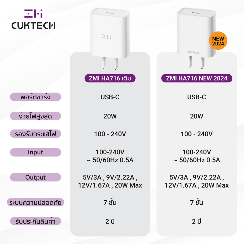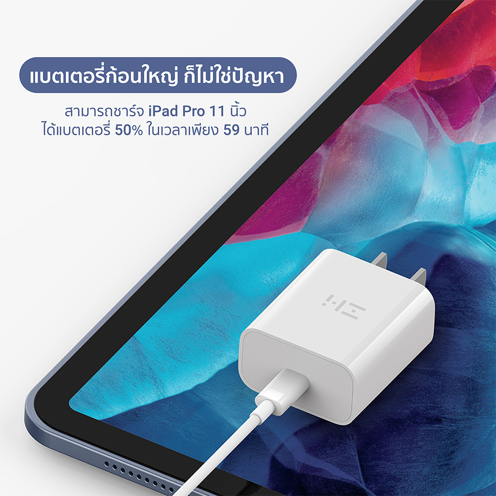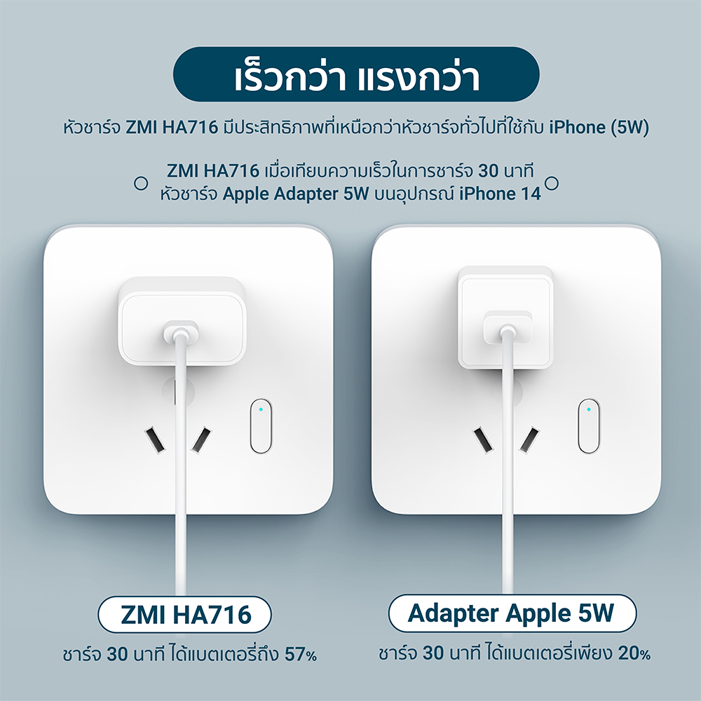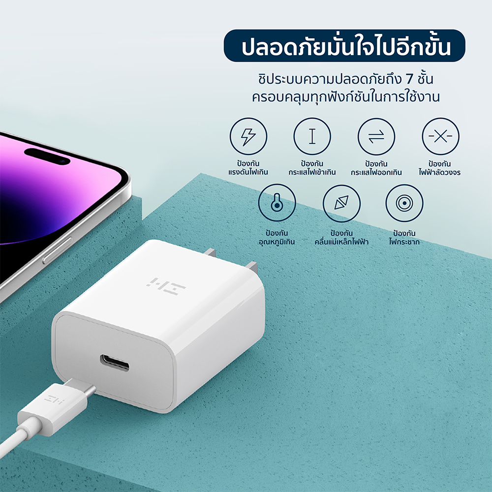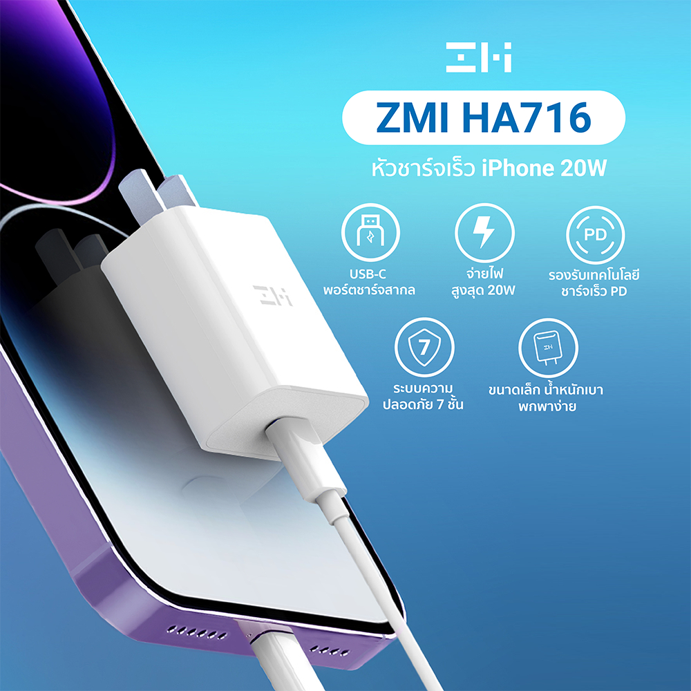 ... 0W ที่เกิดมาเพื่ออุปกรณ์ iPhone โดยเฉพาะ * สำหรับชาร์จ iPhone 14 แบตเตอรี่ 0 - 50% ใน 25 นาที - ชาร์จเร็วกว่า เมื่อเทียบประสิทธิภาพกับหัวชาร์จ Apple 5W * ทดสอบการชาร์จสำหรับ iPhone 14 แบตเตอรี่ 0% ใน 30 นาที * ZMI HA716 ชาร์จ 30 นาที ได้แบตเตอรี่ 0 - 57% * Apple 5W ชาร์จ 30 นาที ได้แบตเตอรี่ 0 - 20% - สามารถชาร์จ iPad Pro 11 นิ้ว แบตเตอรี่ 50% ใน 59 นาที - รองรับกระแสไฟ 100 - 240V ครอบคลุมการใช้งานได้ทั่วโลก - ปลอดภัย มั่นใจได้มากกว่า ด้วยระบบความปลอดภัยถึง 7 ชั้น * ระบบป้องกันแรงดันไฟเกิน * ระบบป้องกันกระแสไฟเข้าเกิน * ระบบป้องกันกระแสไฟออกเกิน * ระบบป้องกันไฟฟ้าลัดวงจร * ระบบป้องกันอุณหภูมิเกิน * ระบบป้องกันคลื่นแม่เหล็กไฟฟ้า * ระบบป้องกันไฟกระชาก - ขนาดเล็กพกพาง่าย ด้วยน้ำหนักเพียง 42.8 กรัม * ZMI HA716 มีขนาดที่เล็กกว่าหัวชาร์จ Apple 20W [[ ข้อมูลสินค้า ]] แบรนด์ : ZMI / CUKTECH รุ่น : ZMI HA716 / ZMI CUKTECH HA716C Input : 100-240V ~ 50/60Hz 0.5A Output : 5V/3A , 9V/2.22A , 12V/1.67A , 20W Max ขนาดสินค้า : 38 x 22.3 x 43 มิลลิเมตร น้ำหนักสินค้า : 42.8 กรัม [[ อุปกรณ์ภายในกล่อง ]] 1x ZMI HA716 / ZMI CUKTECH HA716C 1x คู่มือการใช้งาน ---------------------------------------- 2. ZMI AL870/AL870C สายชาร์จ Type-C to Lightning ความยาวสาย 1 เมตร [[ จุดเด่นสินค้า ]] - รองรับมาตรฐาน MFI การันตีคุณภาพโดยตรงจาก Apple * สามารถใช้ทดแทนอุปกรณ์จากทางแบรนด์ได้ 100% - รองรับเทคโนโลยีชาร์จเร็ว PD (Power Delivery) * เป็นเทคโนโลยีการชาร์จหลักของ Apple ในปัจจุบัน - นำกระแสไฟได้สูงสุด 3A สามารถใช้กับหัวชาร์จเร็วได้สบายๆ - สายชาร์จยาว 1 เมตร ขนาดกำลังดี ไม่ลดทอนกำลังไฟ - ความเร็วในการถ่ายโอนข้อมูลผ่านสายชาร์จถึง 480Mbps - ขั้วต่อแบบ C94 เป็นขั้วมาตรฐานเดียวกันกับ Apple * ทนทานต่อการเกิดออกซิเดชัน และไม่เกิดสนิม - หัวพอร์ตใช้วัสดุ PC + PET ปกป้องพอร์ตชาร์จได้เป็นอย่างดี - ตัวสายหุ้มด้วย TPE มีความยืดหยุ่นสูง ทนทานต่อการหักงอ * ผ่านการทดสอบการหักงอที่มากถึง 10000 ครั้ง [[ ข้อมูลสินค้า ]] แบรนด์ : ZMI รุ่น : ZMI AL870 / AL870C วัสดุ : PC + PET + TPE กำลังไฟที่รองรับ : 3A เทคโนโลยีการชาร์จ : PD3.0 ความยาวของสายชาร์จ : 1 เมตร น้ำหนักสินค้า : 20 กรัม [[ อุปกรณ์ภายในกล่อง ]] 1x ZMI AL870 / AL870C 1x คู่มือการใช้งาน ---------------------------------------- 3. ZMI AL856 สายชาร์จ Type-C to Lightning รองรับการชาร์จเร็ว PD ความยาวสาย 1.5 เมตร [[ เทคโนโลยีและมาตรฐานที่รองรับ ]] * PD (Power Delivery) เป็นเทคโนโลยีมาตรฐานการจ่ายไฟของช่อง USB-C ซึ่งจะจ่ายไฟตามมาตรฐานแรงดันไฟ (Voltage) ได้ตั้งแต่ 5V ถึง 20V [[ จุดเด่นสินค้า ]] - รองรับมาตรฐาน MFI การันตีคุณภาพโดยตรงจาก Apple * สามารถใช้ทดแทนอุปกรณ์จากทางแบรนด์ได้ 100% - รองรับเทคโนโลยีชาร์จเร็ว PD (Power Delivery) * เป็นเทคโนโลยีการชาร์จหลักของ Apple ในปัจจุบัน - นำกระแสไฟได้สูงสุด 3A สามารถใช้กับหัวชาร์จเร็วได้สบายๆ - สายชาร์จยาว 1.5 เมตร ขนาดกำลังดี ไม่ลดทอนกำลังไฟ - ความเร็วในการถ่ายโอนข้อมูลผ่านสายช