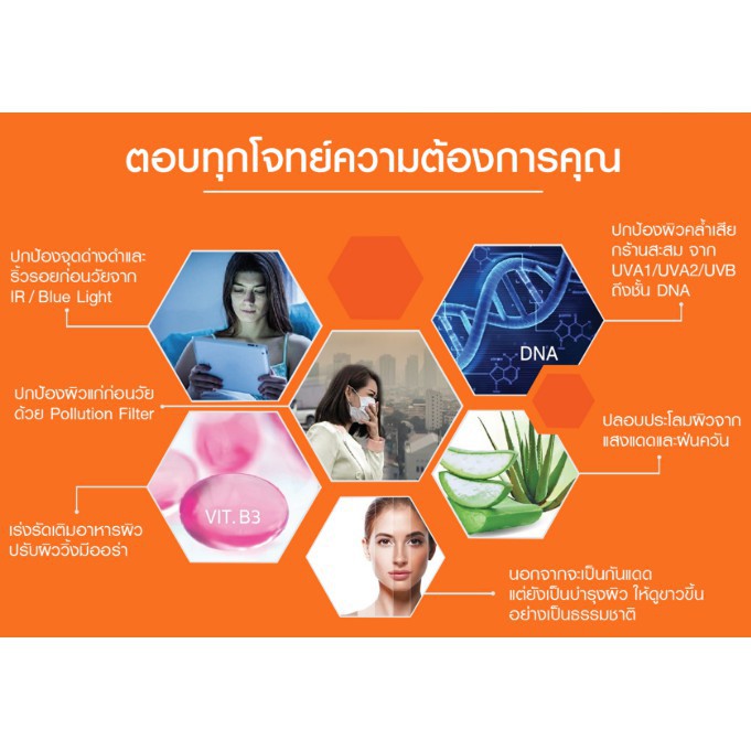 ... llution Filter • ป้องกันผิวหมอง และริ้วรอยก่อนวัยจาก IR/Blue Light • ปกป้องผิวถูกทำร้ายลึกถึงชั้น DNA ผิวคล้ำเสีย กร้านสะสม จากรังสี UVA1/UVA2/UVB • มี AQUA ALOE VERA EXTRACT ช่วยปลอบประโลมผิวจากการทำร้าย จากแสงแดดและฝุ่นควัน ให้กลับมาชุ่มชื่น น่าสัมผัส • เติมอาหารผิวต้านความแก่ด้วยวิตามินอี พร้อมปรับผิววิ้งมีออร่าด้วย วิตามินบี 3 เนื้อเบา สบายผิว • สูตรคุมความมัน • ไม่เหนอะ ไม่มัน ไม่อุดตัน วิธีใช้ : ทาให้ทั่วหน้าและลำคอ เป็นขั้นตอนสุดท้ายก่อนการแต่งหน้าและก่อนสัมผัสแสงแดด ปริมาณสุทธิ 7 กรัม (ซอง) เลขที่ใบรับแจ้ง 10-1-6200002835 EXP 04/2023