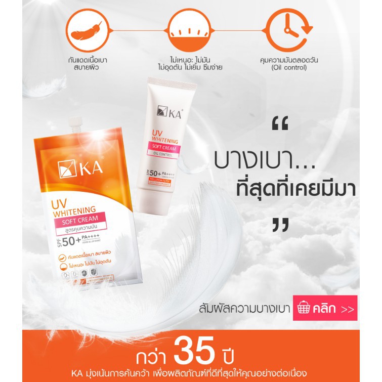 สูตรใหม่!! เคเอ ยูวี ไวท์เทนนิ่ง ซิฟท์ครีม ออยคอนโทรล KA UV WHITENING SOFT CREAM OUL CONTROL SPF 50+ PA++++ กันแดดบางเบา.... เบาสุดที่เคยมีมา ครีมกันแดดเนื้อซอฟท์ครีมสำหรับผิวหน้า สัมผัสเบา ไม่มัน สบายผิว แม้แดดแรง-แรงมากก็พร้อมปกป้องทุกอณูผิวจากแสงแดด • ปกป้องผิวหน้าแก่ก่อนวัยด้วย Po