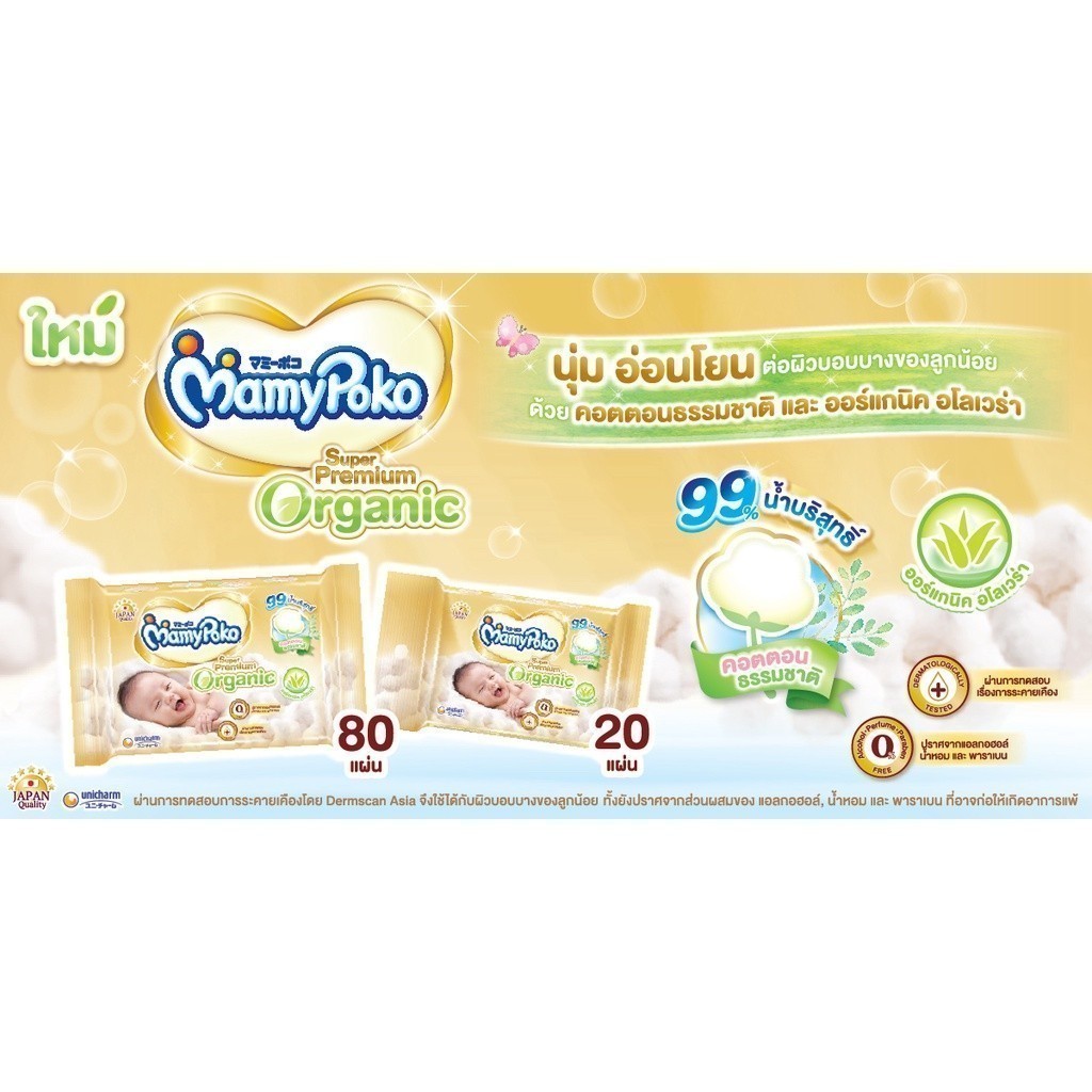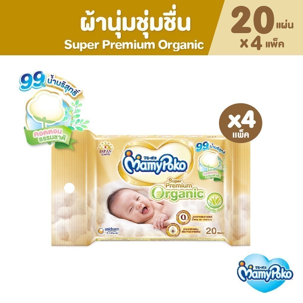 MamyPoko มามี่โพโค ไวพส์ ทิชชู่เปียก ซูปเปอร์ พรีเมี่ยม ออร์แกนิค 20 ชิ้น (4 แพ็ค)