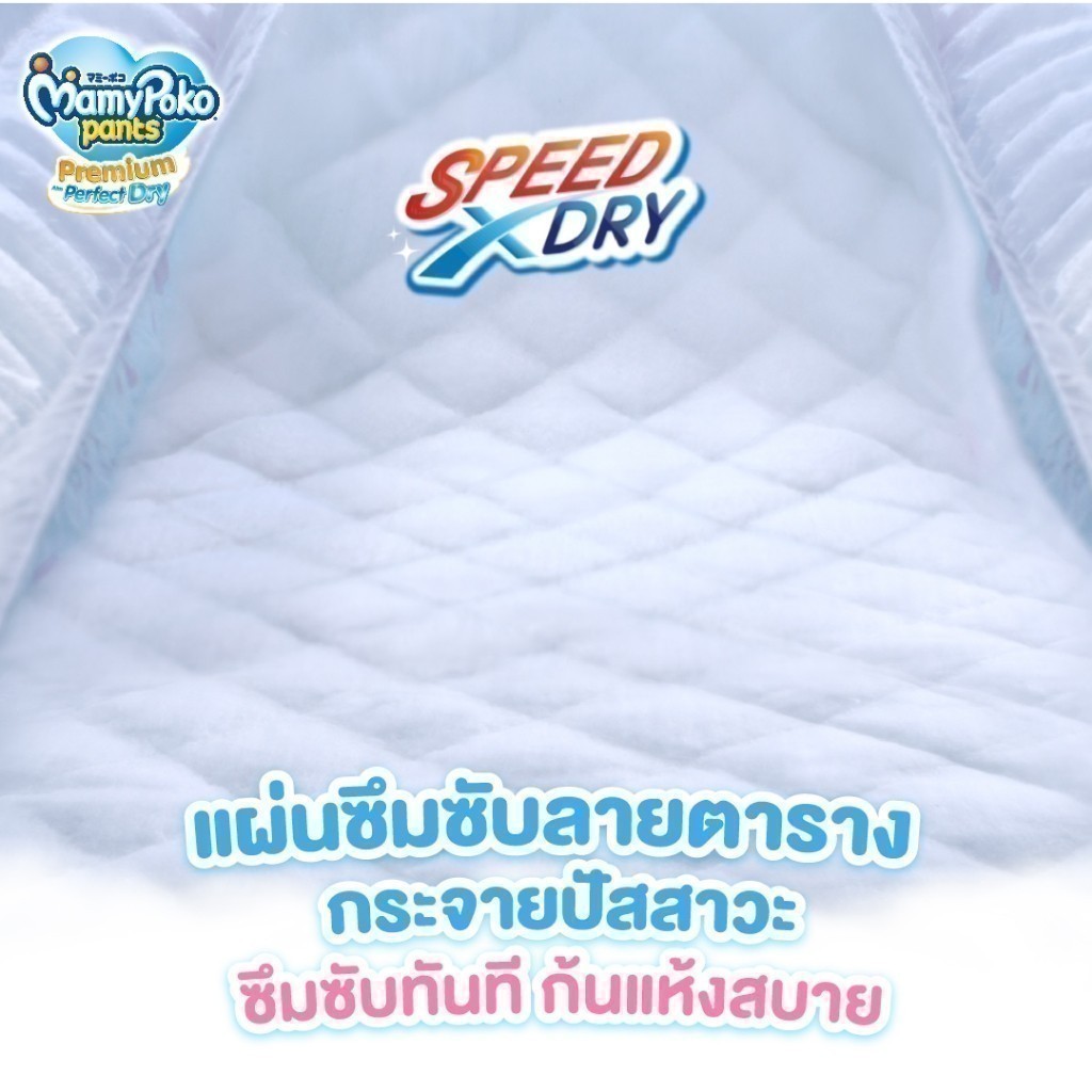 ใหม่! MamyPoko Pants Premium Aim Perfect Dry (มามี่โพโค แพ้นท์ พรีเมี่ยม เอม เพอร์เฟกต์ ดราย) กางเกงผ้าอ้อมเด็กสำเร็จรูปพรีเมี่ยมที่ แห้งสบายที่สุด**จากมามี่โพโค คุณสมบัติพิเศษ (ไซซ์ S-XXL) - ใหม่! Speed X Dry (สปีด เอ็กซ์ ดราย) แผ่นซึมซับพิเศษลายตาราง ช่วยกระจายปัสสาวะลงตามร่องได้ทั่วทั้งแผ่นแ