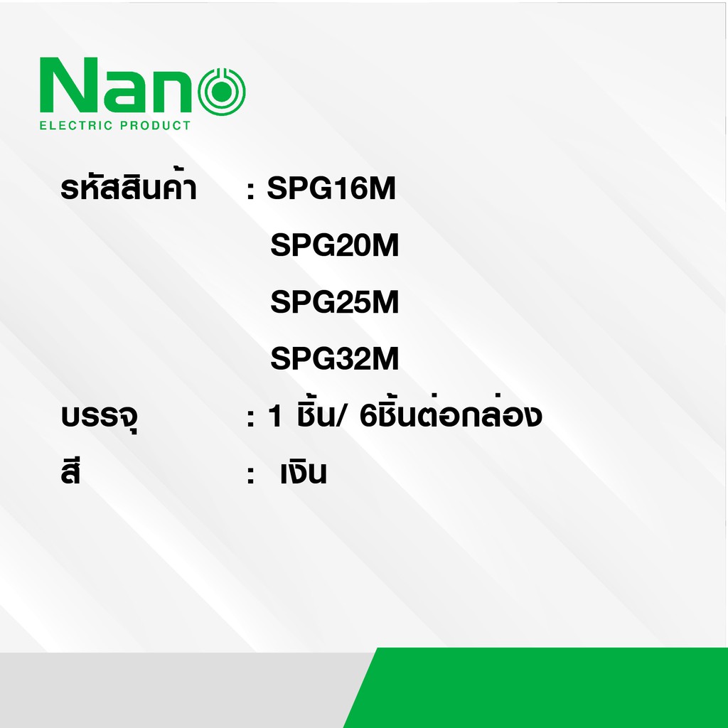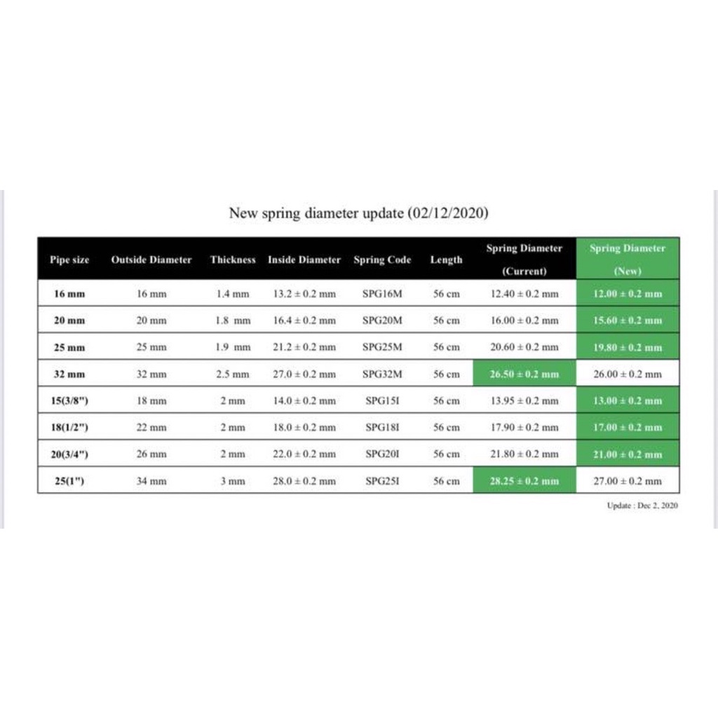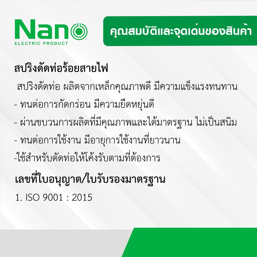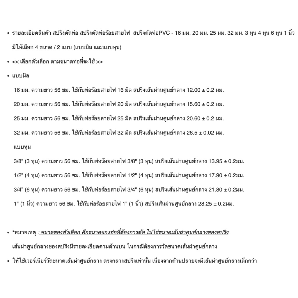 ... มม. 32 มม. ความยาว 56 ซม. ใช้กับท่อร้อยสายไฟ 32 มิล สปริงเส้นผ่านศูนย์กลาง 26.5 ± 0.02 มม. แบบหุน 3/8” (3 หุน) ความยาว 56 ซม. ใช้กับท่อร้อยสายไฟ 3/8" (3 หุน) สปริงเส้นผ่านศูนย์กลาง 13.95 ± 0.2มม. 1/2” (4 หุน) ความยาว 56 ซม. ใช้กับท่อร้อยสายไฟ 1/2" (4 หุน) สปริงเส้นผ่านศูนย์กลาง 17.90 ± 0.2มม. 3/4” (6 หุน) ความยาว 56 ซม. ใช้กับท่อร้อยสายไฟ 3/4" (6 หุน) สปริงเส้นผ่านศูนย์กลาง 21.80 ± 0.2มม. 1" (1 นิ้ว) ความยาว 56 ซม. ใช้กับท่อร้อยสายไฟ 1" (1 นิ้ว) สปริงเส้นผ่านศูนย์กลาง 28.25 ± 0.2มม.   เลขที่ใบอนุญาติ/ใบรับรองมาตรฐาน 1. ISO 9001 : 2015
