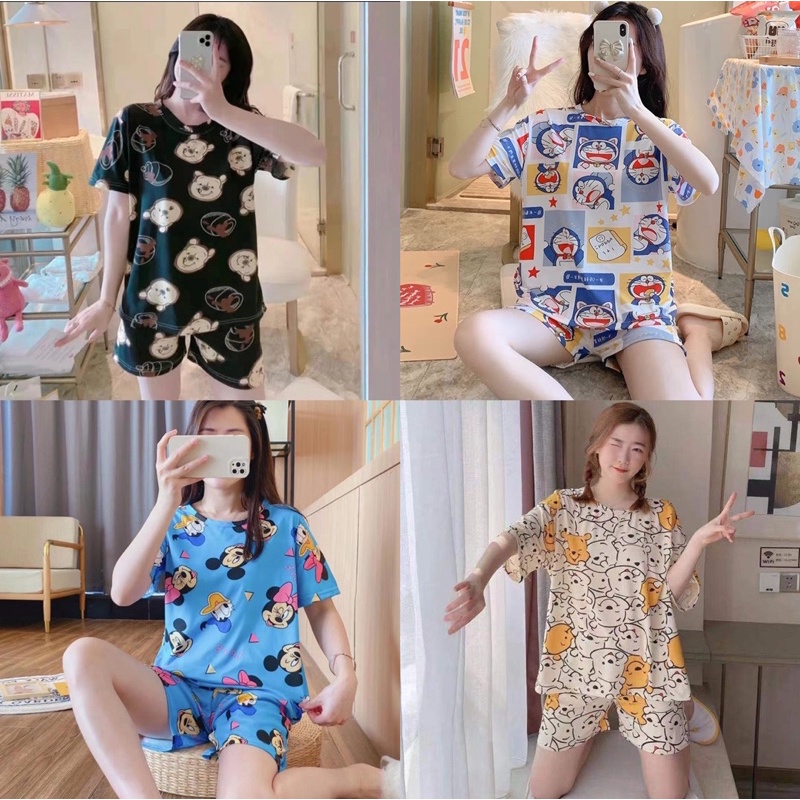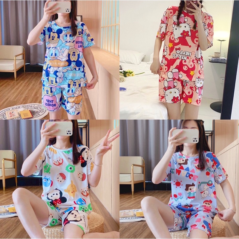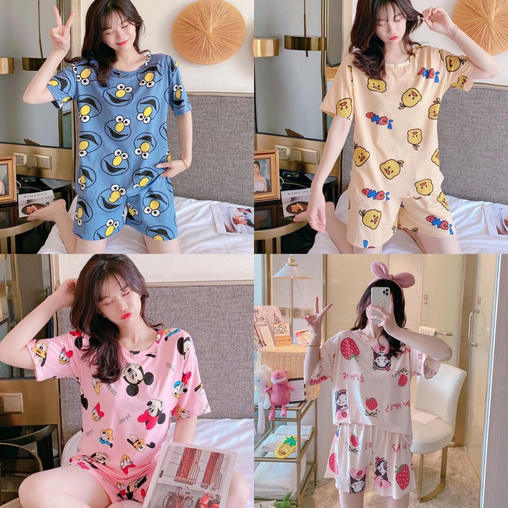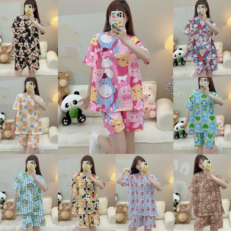 🔥ราคาพิเศษ🔥 ชุดนอน คอกลมเสื้อแขนสั้น+ขาสั้น ลายการ์ตูน ผ้าคอตตอน เนื้อผ้านิ่ม ใส่สบาย ฟรีไซส์ WT