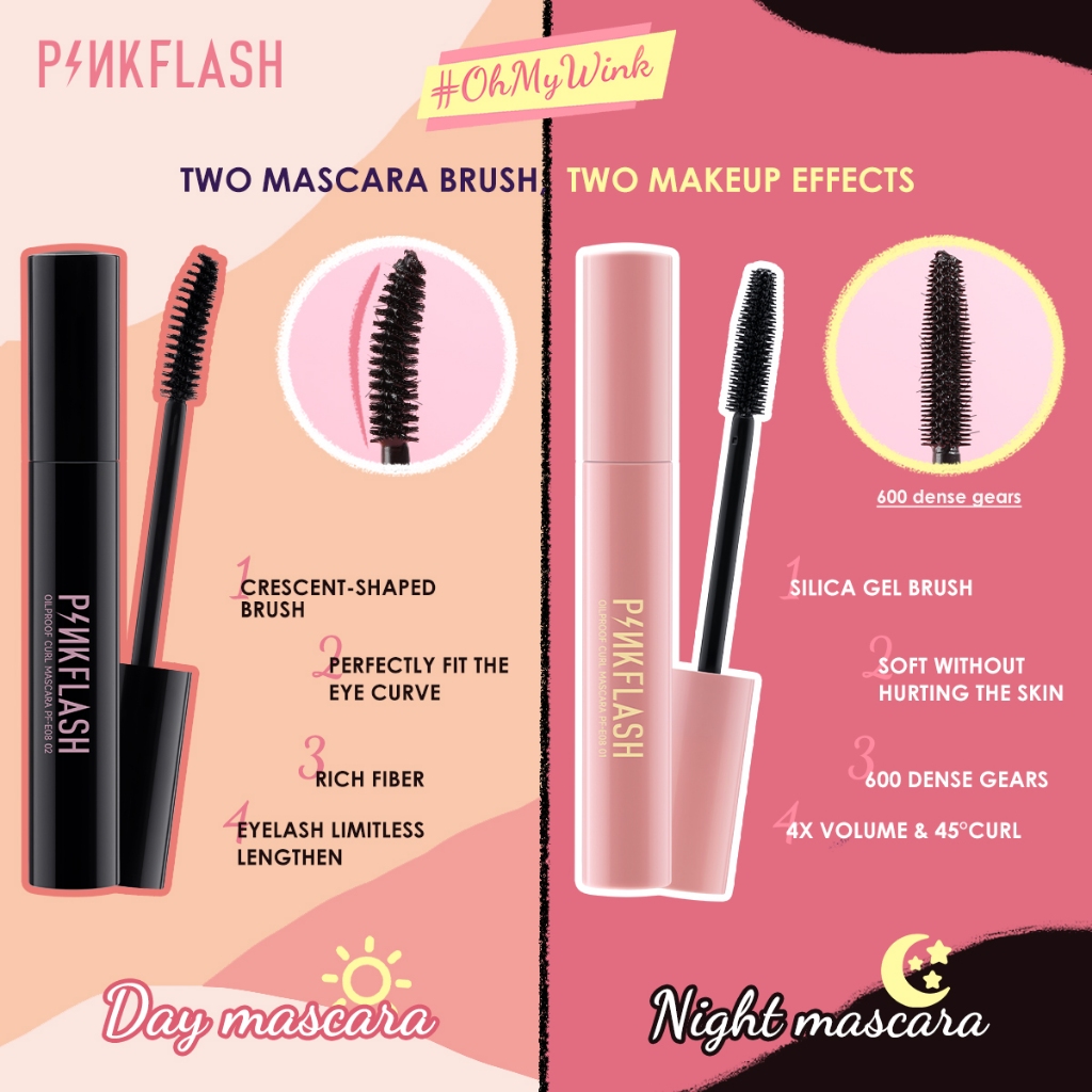 PINKFLASH มาสคาร่าสำหรับทั้งกลางวันและกลางคืน - มาสคาร่าแบบกลางวัน สร้างเอฟเฟกต์การแต่งหน้าที่ทำให้ขนตาดูยาวและเป็นธรรมชาติด้วย เส้นใยไมโคร - มาสคาร่าแบบกลางคืนเพิ่มความหนาของขนตาสี่เท่า งอน เด้งด้วยดวงตาสุดเซ็กซี่สวยประหาร PINKFLASH มาสคาร่า ฝาสีดำสำหรับกลางวัน - ประกอบด้วยเส้นใยไฟเบอร์หนา