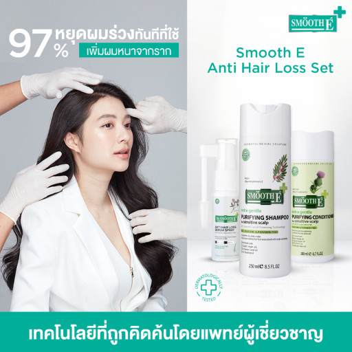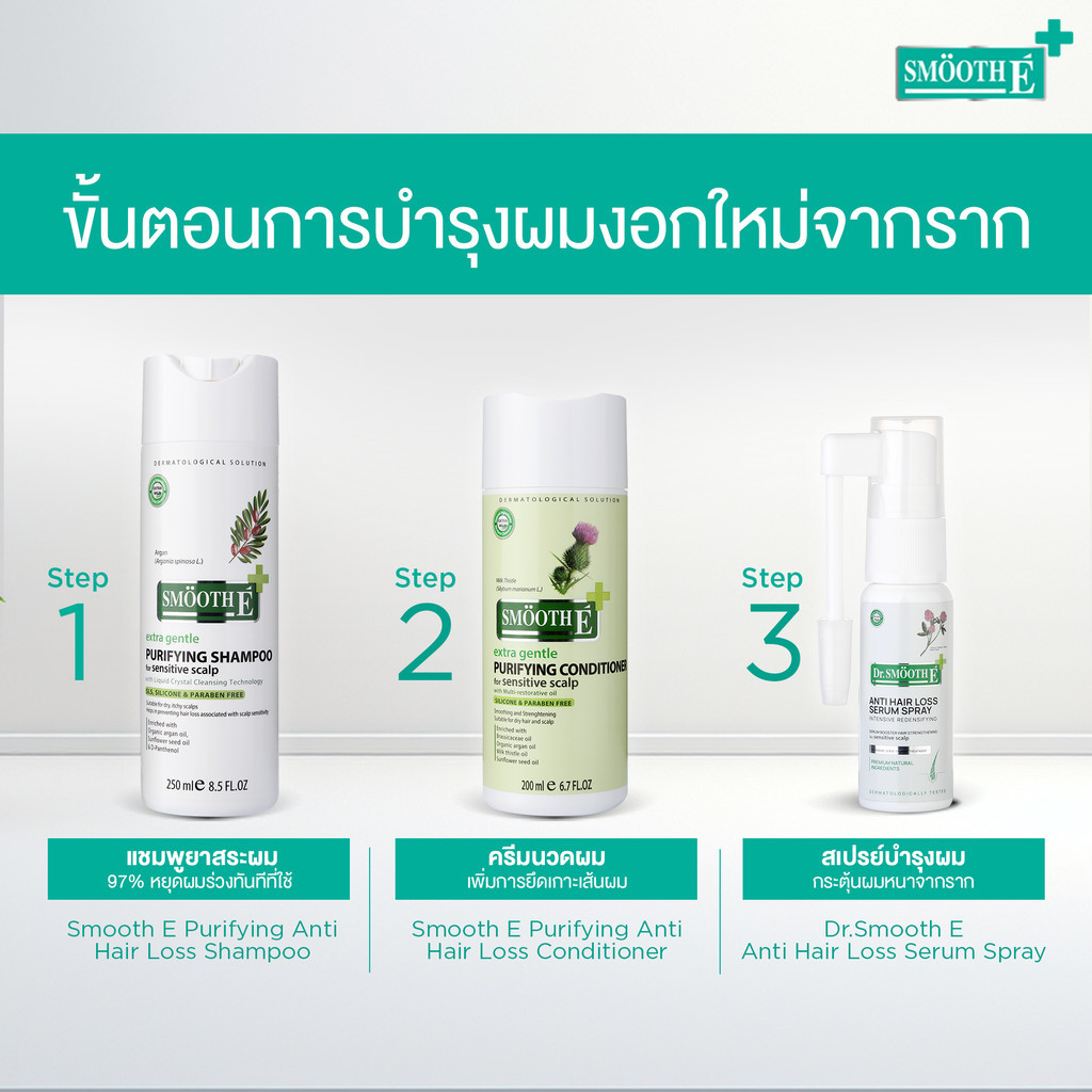Smooth E Anti Hair loss Shampoo 100 ml. / 250 ml. แชมพูลดผมร่วง ขจัดรังแค บำรุงผมและหนังศีรษะ ด้วยสารสกัดธรรมชาติ สมูทอี เพราะ 90% ของผมร่วง มีสาเหตุมาจากหนังศีรษะอักเสบ รังแค และเชื้อรา ใหม่! ครีมนวดผมสูตรอ่อนโยนสำหรับหนังศีรษะที่บอบบางและระคายเคืองง่ายที่มีส่วนผสมของ Multi-restorative oi