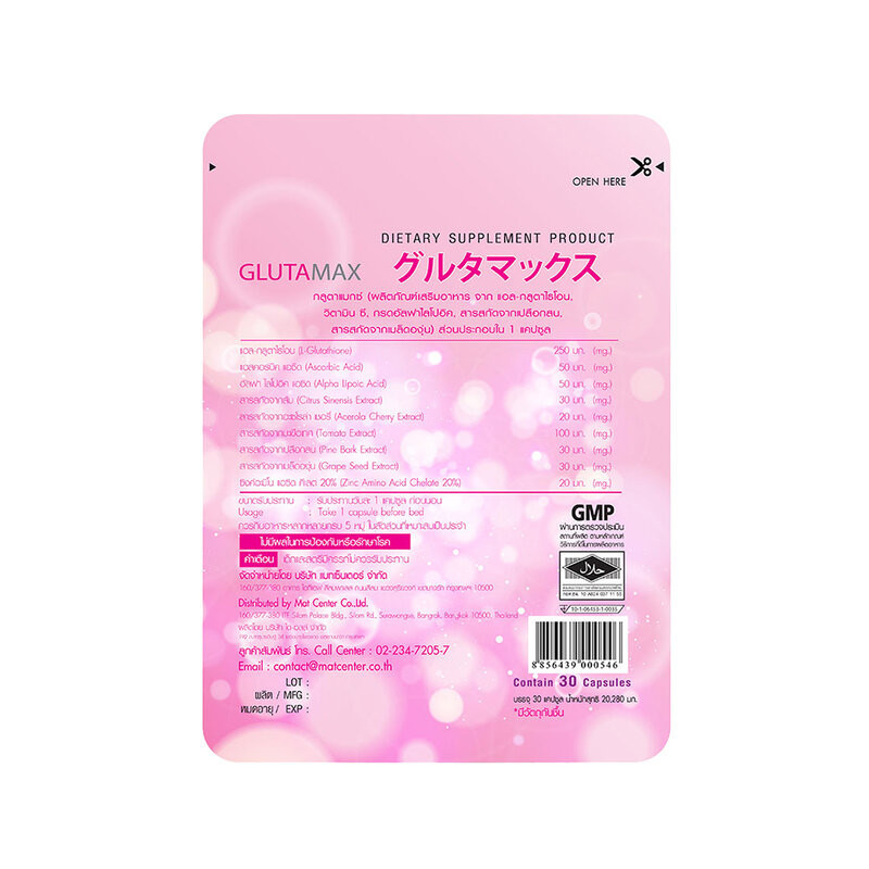 GlutaMax by VidaL-Glutathione 250mg (30 Capsules)ผลิตภัณฑ์เสริมอาหารในรูปแบบแคปซูล ที่มีส่วนประกอบจากแอล-กลูต้าไธโอน นำเข้าจากประเทศญี่ปุ่น และวัตถุดิบคัดสรร ได้แก่ วิตามินซี, กรดอัลฟาไลโปอิค, สารสกัดจากเปลือกสน, ซิงค์ และสารสกัดจากผลไม้ต่างๆ ได้แก่ ส้ม มะเขือเทศ และเมล็ดองุ่น ส่วนประกอบ • แอล-กลู