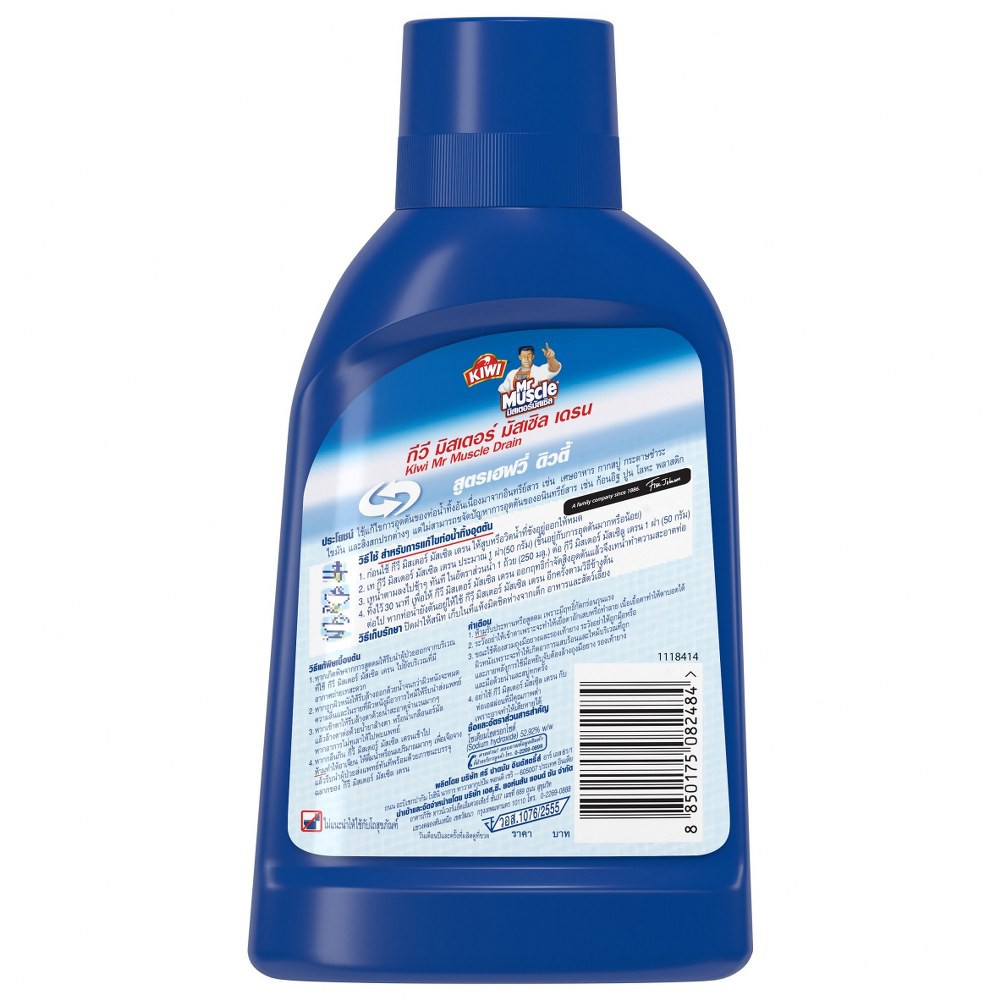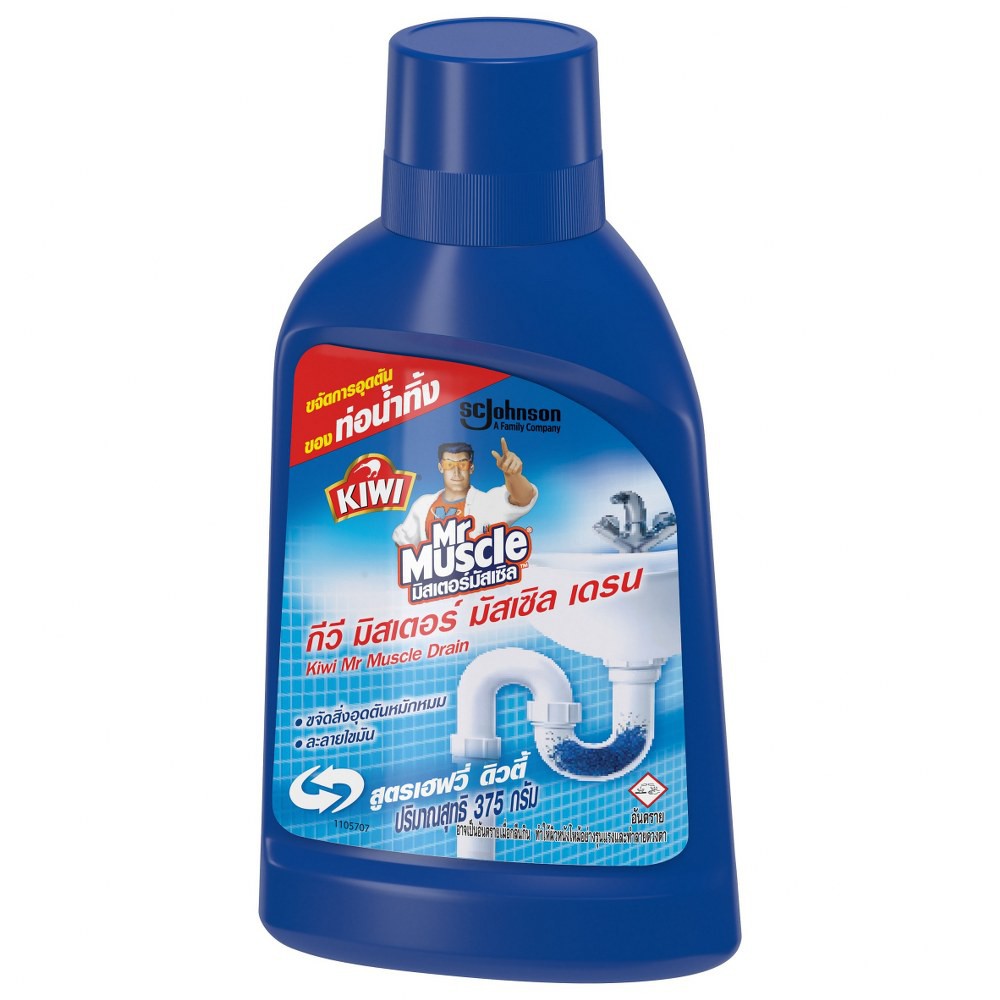 กีวี มิสเตอร์มัสเซิล เดรน ขจัดการอุดตันของท่อน้ำทิ้ง ขจัดสิ่งอุดตันหมักหมม ละลายไขมัน ใช้แก้ไขการอุดตันของท่อน้ำทิ้งอันเนื่องมาจากอินทรีย์สาร เช่น เศษอาหาร กากสบู่ กระดาษชำระ ไขมันและสิ่งสกปรกต่างๆ แต่ไม่สามารถขจัดปัญหาการอุดตันของอนินทรีย์สาร เช่น ก้อนอิฐ ปูน โลหะ พลาสติก วิธีใช้ ต้องสวมถ