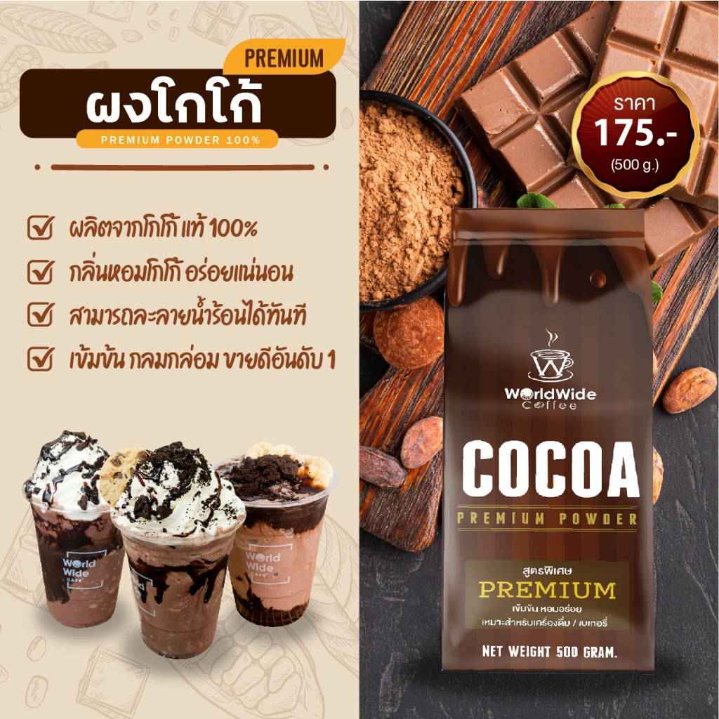 📌โกโก้พรีเมี่ยม เป็นผงโกโก้ 100% หอมอร่อย เข้มข้น ชงกินเองก็ถูกใจทุกวัย ชงค้าขายลูกค้าก็ติดใจแน่นอน เครื่องดื่มโกโก้ชนิดผง (แบรนด์เวิลด์ไวด์คอฟฟี่) เป็นผงโกโก้ 100% นำเข้าจากประเทศเนเธอร์แลนด์ คัดสรรอย่างดี ซึ่งมีไขมันโกโก้ 12% ทำให้เมื่อนำมาชงเป็นเครื่องดื่มจะได้รสชาติของโกโก้ที่เข้มข้น หอมกลิ