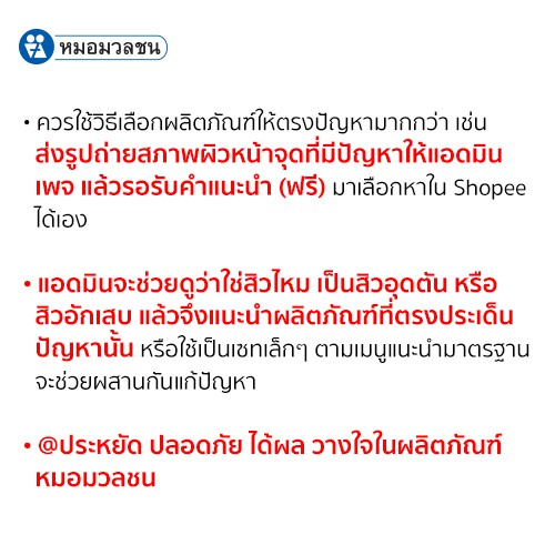 ... ื่อช่วยเพิ่มความชุ่มชื้น ปริมาณสุทธิ : 10 กรัม เลขที่ใบรับจดแจ้ง : 10-1-6010061025 บาร์โค้ด : 8859414701100 เมื่อซื้อสินค้าครบ 500 บาท รับฟรี Gift Voucher มูลค่า 200 บาท เงื่อนไขการใช้ Gift Voucher 1. ใช้แทนเงินสดชำระค่าสินค้าหรือบริการได้ ได้ที่ศูนย์บริการผลิตภัณฑ์หมอมวลชนทุกสาขา 2. ไม่สามารถใช้ซื้อสินค้าทางออนไลน์ได้ 3. กรุณาแสดงคูปองเพื่อใช้สิทธิ์ทุกครั้ง 4. คูปองนี้สามารถให้ผู้อื่นใช้แทนท่านได้ 5. คูปองนี้ไม่สามารถแลกรับเป็นเงินสด หรือทอนเป็นเงินสด 6. เพื่อความสะดวกในการเข้ารับบริการของท่าน กรุณาโทรจองล่วงหน้า 7. คูปองมีอายุ 30 วัน นับจากวันที่ออกคูปอง