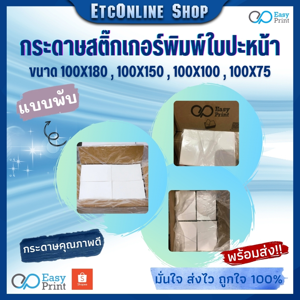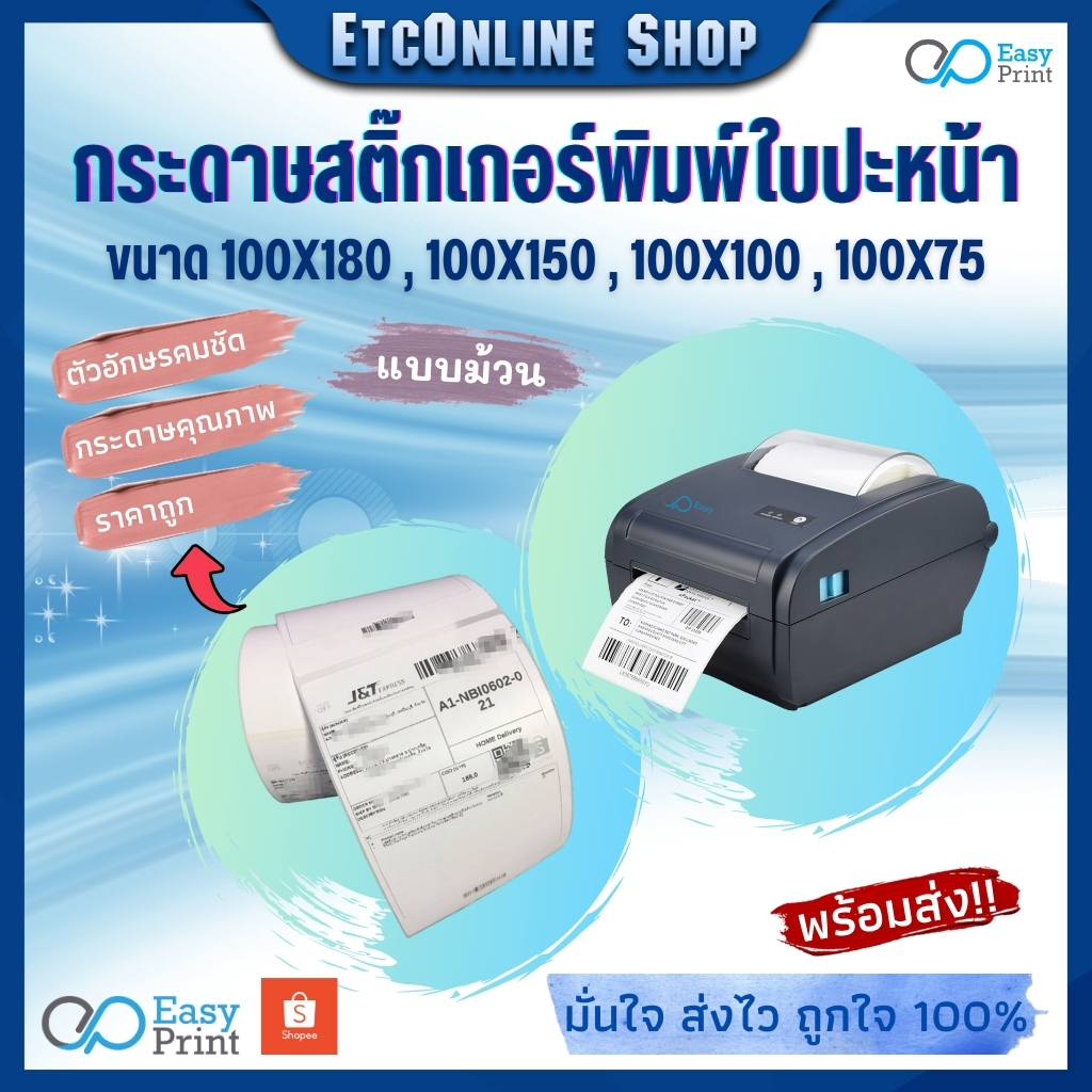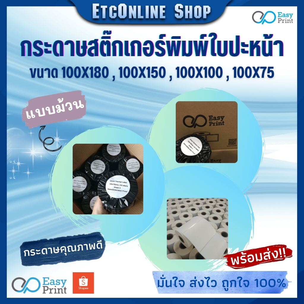 ... ้าเท่านั้น ไม่สามารถขอออกใบกำกับภาษีย้อนหลังหรือแก้ไขข้อมูลในใบกำกับภาษี เอกสารจัดส่งเป็นไฟล์ PDF ทางอีเมล์ 5-7 วันทำการ ขอบคุณค่ะ) ⛔️ ⛔️ แบบม้วน 100*150mm 500แผ่น (📌ใส่ 9910/9930 ไม่ได้ ใช้ได้เฉพาะรุ่น 9920 หรือ 9900 แบบมีที่วาง เท่านั้น)⛔️⛔️ 🚚🚚จัดส่งด่วนทุกวัน 🚚🚚 📌ตัดรอบ 12.00 น. ทุกวัน ใช้เวลา 1-3 วัน ถึง ลค 📌 สามารถมารับสินค้าเองที่จุดรับสินค้า หรือเรียกเมสเซนเจอร์ได้ 9.00-17.30 ✅ทางร้านจัดส่งทุกวันทันรอบแต่ละขนส่ง การจัดส่งเร็วหรือล่าช้าขึ้นอยู่กับการให้บริการของขนส่งเจ้านั้นๆ ไม่เกี่ยวกับร้านค้า จึงขอให้ทางลูกค้าเข้าใจร้านค้าด้วยคับ 📌ลูกค้าติดตามสถานะสินค้าได้จากระบบ Shopee หรือโทร 02-0178399 เพื่อติดต่อ Call Center เพื่อความรวดเร็ว 📌ทางร้านไม่รับคืนสินค้าทุกกรณี ยกเว้นส่งผิดรุ่น 📃📃กระดาษความร้อนสติ๊กเกอร์ EasyPrint Direct Thermal ขนาด 100x150 100x100 100x75mm 👍คุณสมบัติ 📌สติ๊กเกอร์เนื้อกระดาษกึ่งมันกึ่งด้าน มุมมน สีขาว 📌ปริ้นง่ายใช้กับเครื่อง direct thermal ไม่ต้องใช้หมึก ตัวหนังสือคมชัด 📌ใช้งานได้หลายรูปแบบ ทั้งใบปะหน้าสินค้า ลาเบลบาร์โค้ดติดกล่อง, ป้ายสินค้าติดกล่อง, สติ๊กเกอร์บาร์โค้ด, สติ๊กเกอร์ทั่วไป 📌สามารถกันน้ำ/กันน้ำมันได้ กันรอยขีดข่วน 📌กาวชนิดเหนียวพิเศษเพิ่มแรงยึดติด 📌กระดาษมีรอยปรุระหว่างแผ่นต่อแผ่น ทำให้ฉีกง่ายมาก 📌ห่อด้วยพลาสติกทึบแสง สามารถเก็บได้นานโดยไม่มีผลต่อคุณภาพกระดาษ 📌จำนวนกระดาษอาจมีการคลาดเคลื่อน 1-3% เนื่องจากกระบวนการผลิต 📌แบบพับ Fan Fold เหมาะสำหรับ รุ่น ES-9900UB (ถ้ารุ่น 9910/9920/9930 จะต้องตั้งด้านนอกข้างหลังของตัวเครื่อง) ✅ แบบพับ 100*150mm 500แผ่น (เหมาะสำหรับ Shopee, Laz, Shippop, Kerry, Vrich, Shipnity, CFManager, Page365, Xcom, Zortout, MyOrder, TiktokShop ฯลฯ) ✅ แบบพับ 100*100mm 500แผ่น (เหมาะสำหรับ Shopeeผ่านPCเท่านั้น(ไม่เต็มแผ่น), MyOrder, Fillgood ฯลฯ) ✅ แบบพับ 100*75 mm 1000แผ่น (เหมาะสำหรับ FlashExpress, Kerry, SCG, BestExpress, MyOrder, XCOM ฯลฯ) 📌แบบม้วน Roll เหมาะสำหรับ รุ่น ES-9910/9920/9930 (ถ้ารุ่น 9900 จะต้องมีที่วางกระดาษเพราะต้องมีแกนเพื่อหมุนกระดาษ) ✅ แบบม้วน 100*180mm 300แผ่น (เหมาะสำหรับ J&TExpress, FlashExpress, MyOrder ฯลฯ) ✅ แบบม้วน 100*150mm 350แผ่น /500แผ่น (📌ม้วน 500 แผ่นใส่9910/9930 ไม่ได้)(เหมาะสำหรับ Shopee, Laz, Shippop, Kerry, Vrich, Shipnity, CFManager, Page365, Xcom, Zortout, MyOrder, Fillgood, TiktokShop ฯลฯ) ✅ แบบม้วน 100*150mm 350แผ่น แบบ Cut 75 แบ่ง 75+75 สามารถที่จะเก็บรายการสินค้าไว้ในกล่องเพื่อไม่ต้องการให้รู้ว่าภายในเป็นสินค้าอะไร (เหมาะสำหรับ Shopee, Vrich) ✅ แบบม้วน 100*150mm 350แผ่น แบบ Cut 100 แบ่ง 100+50 สามารถที่จะเก็บรายการสินค้าไว้ในกล่องเพื่อไม่ต้องการให้รู้ว่าภายในเป็นสินค้าอะไร (เหมาะสำหรับ TiktokShop ) ✅ แบบม้วน 100*100mm 350แผ่น (เหมาะสำหรับ Shopeeผ่านPCเท่านั้น(ไม่เต็มแผ่น), MyOrder, Fillgood ฯลฯ) ✅ แบบม้วน 100*75 mm 500แผ่น (เหมาะสำหรับ FlashExpress, Kerry, SCG, BestExpress, MyOrder, XCOM ฯลฯ) 📌รบกว