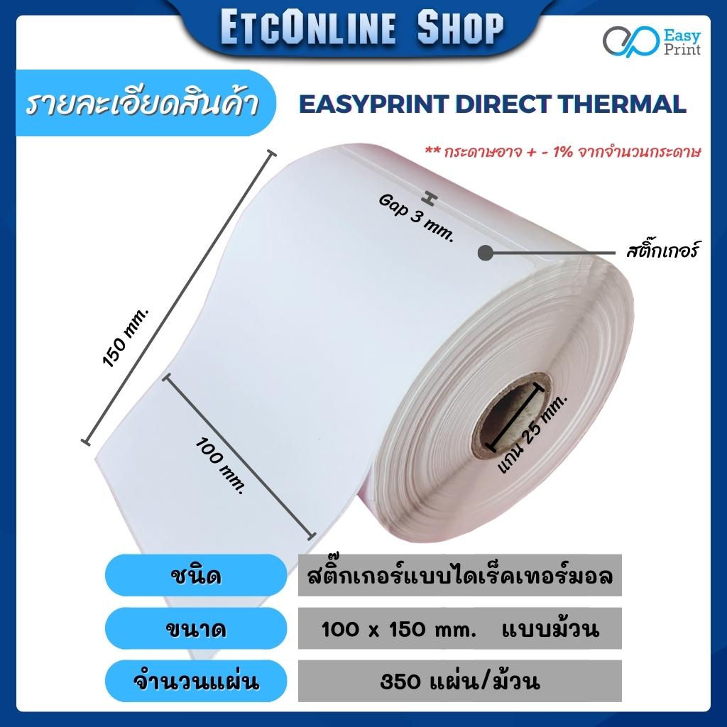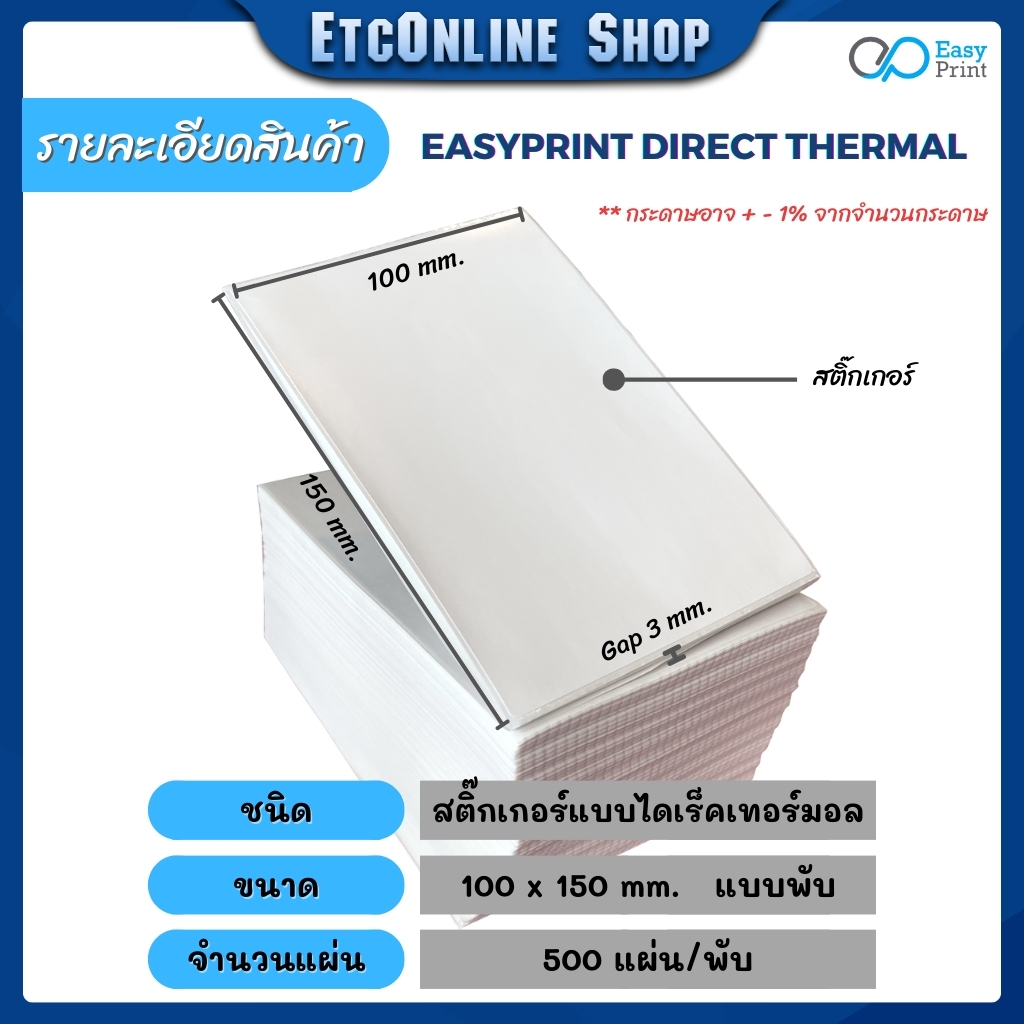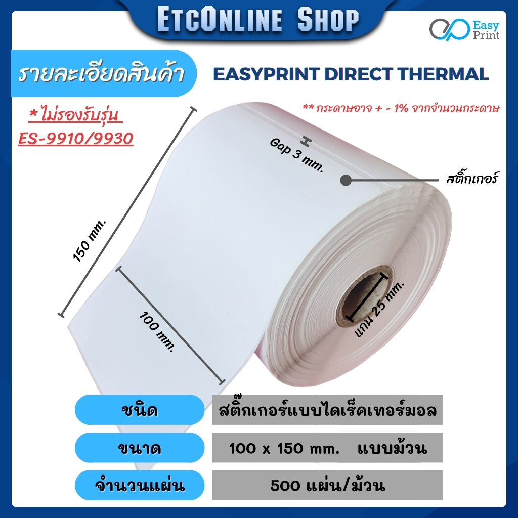 ... ้าเท่านั้น ไม่สามารถขอออกใบกำกับภาษีย้อนหลังหรือแก้ไขข้อมูลในใบกำกับภาษี เอกสารจัดส่งเป็นไฟล์ PDF ทางอีเมล์ 5-7 วันทำการ ขอบคุณค่ะ) ⛔️ ⛔️ แบบม้วน 100*150mm 500แผ่น (📌ใส่ 9910/9930 ไม่ได้ ใช้ได้เฉพาะรุ่น 9920 หรือ 9900 แบบมีที่วาง เท่านั้น)⛔️⛔️ 🚚🚚จัดส่งด่วนทุกวัน 🚚🚚 📌ตัดรอบ 12.00 น. ทุกวัน ใช้เวลา 1-3 วัน ถึง ลค 📌 สามารถมารับสินค้าเองที่จุดรับสินค้า หรือเรียกเมสเซนเจอร์ได้ 9.00-17.30 ✅ทางร้านจัดส่งทุกวันทันรอบแต่ละขนส่ง การจัดส่งเร็วหรือล่าช้าขึ้นอยู่กับการให้บริการของขนส่งเจ้านั้นๆ ไม่เกี่ยวกับร้านค้า จึงขอให้ทางลูกค้าเข้าใจร้านค้าด้วยคับ 📌ลูกค้าติดตามสถานะสินค้าได้จากระบบ Shopee หรือโทร 02-0178399 เพื่อติดต่อ Call Center เพื่อความรวดเร็ว 📌ทางร้านไม่รับคืนสินค้าทุกกรณี ยกเว้นส่งผิดรุ่น 📃📃กระดาษความร้อนสติ๊กเกอร์ EasyPrint Direct Thermal ขนาด 100x150 100x100 100x75mm 👍คุณสมบัติ 📌สติ๊กเกอร์เนื้อกระดาษกึ่งมันกึ่งด้าน มุมมน สีขาว 📌ปริ้นง่ายใช้กับเครื่อง direct thermal ไม่ต้องใช้หมึก ตัวหนังสือคมชัด 📌ใช้งานได้หลายรูปแบบ ทั้งใบปะหน้าสินค้า ลาเบลบาร์โค้ดติดกล่อง, ป้ายสินค้าติดกล่อง, สติ๊กเกอร์บาร์โค้ด, สติ๊กเกอร์ทั่วไป 📌สามารถกันน้ำ/กันน้ำมันได้ กันรอยขีดข่วน 📌กาวชนิดเหนียวพิเศษเพิ่มแรงยึดติด 📌กระดาษมีรอยปรุระหว่างแผ่นต่อแผ่น ทำให้ฉีกง่ายมาก 📌ห่อด้วยพลาสติกทึบแสง สามารถเก็บได้นานโดยไม่มีผลต่อคุณภาพกระดาษ 📌จำนวนกระดาษอาจมีการคลาดเคลื่อน 1-3% เนื่องจากกระบวนการผลิต 📌แบบพับ Fan Fold เหมาะสำหรับ รุ่น ES-9900UB (ถ้ารุ่น 9910/9920/9930 จะต้องตั้งด้านนอกข้างหลังของตัวเครื่อง) ✅ แบบพับ 100*150mm 500แผ่น (เหมาะสำหรับ Shopee, Laz, Shippop, Kerry, Vrich, Shipnity, CFManager, Page365, Xcom, Zortout, MyOrder, TiktokShop ฯลฯ) ✅ แบบพับ 100*100mm 500แผ่น (เหมาะสำหรับ Shopeeผ่านPCเท่านั้น(ไม่เต็มแผ่น), MyOrder, Fillgood ฯลฯ) ✅ แบบพับ 100*75 mm 1000แผ่น (เหมาะสำหรับ FlashExpress, Kerry, SCG, BestExpress, MyOrder, XCOM ฯลฯ) 📌แบบม้วน Roll เหมาะสำหรับ รุ่น ES-9910/9920/9930 (ถ้ารุ่น 9900 จะต้องมีที่วางกระดาษเพราะต้องมีแกนเพื่อหมุนกระดาษ) ✅ แบบม้วน 100*180mm 300แผ่น (เหมาะสำหรับ J&TExpress, FlashExpress, MyOrder ฯลฯ) ✅ แบบม้วน 100*150mm 350แผ่น /500แผ่น (📌ม้วน 500 แผ่นใส่9910/9930 ไม่ได้)(เหมาะสำหรับ Shopee, Laz, Shippop, Kerry, Vrich, Shipnity, CFManager, Page365, Xcom, Zortout, MyOrder, Fillgood, TiktokShop ฯลฯ) ✅ แบบม้วน 100*150mm 350แผ่น แบบ Cut 75 แบ่ง 75+75 สามารถที่จะเก็บรายการสินค้าไว้ในกล่องเพื่อไม่ต้องการให้รู้ว่าภายในเป็นสินค้าอะไร (เหมาะสำหรับ Shopee, Vrich) ✅ แบบม้วน 100*150mm 350แผ่น แบบ Cut 100 แบ่ง 100+50 สามารถที่จะเก็บรายการสินค้าไว้ในกล่องเพื่อไม่ต้องการให้รู้ว่าภายในเป็นสินค้าอะไร (เหมาะสำหรับ TiktokShop ) ✅ แบบม้วน 100*100mm 350แผ่น (เหมาะสำหรับ Shopeeผ่านPCเท่านั้น(ไม่เต็มแผ่น), MyOrder, Fillgood ฯลฯ) ✅ แบบม้วน 100*75 mm 500แผ่น (เหมาะสำหรับ FlashExpress, Kerry, SCG, BestExpress, MyOrder, XCOM ฯลฯ) 📌รบกว