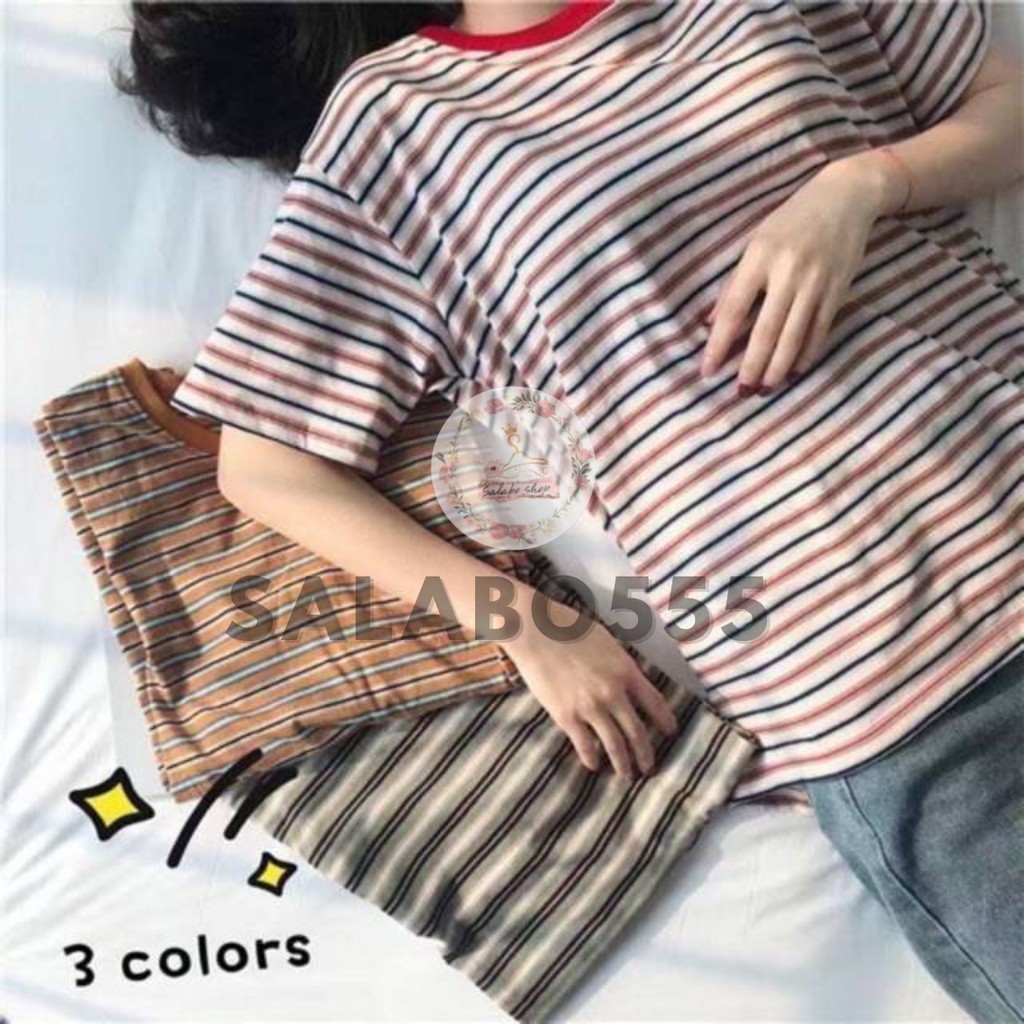 SALABO(พร้อมส่ง) เสื้อยืดคอกลมแขนสั้นพิมพ์ลายทางลำลอง สไตล์: วินเทจ สำหรับผู้หญิง เรียบๆแต่สวยใส่ชิวๆ #9304