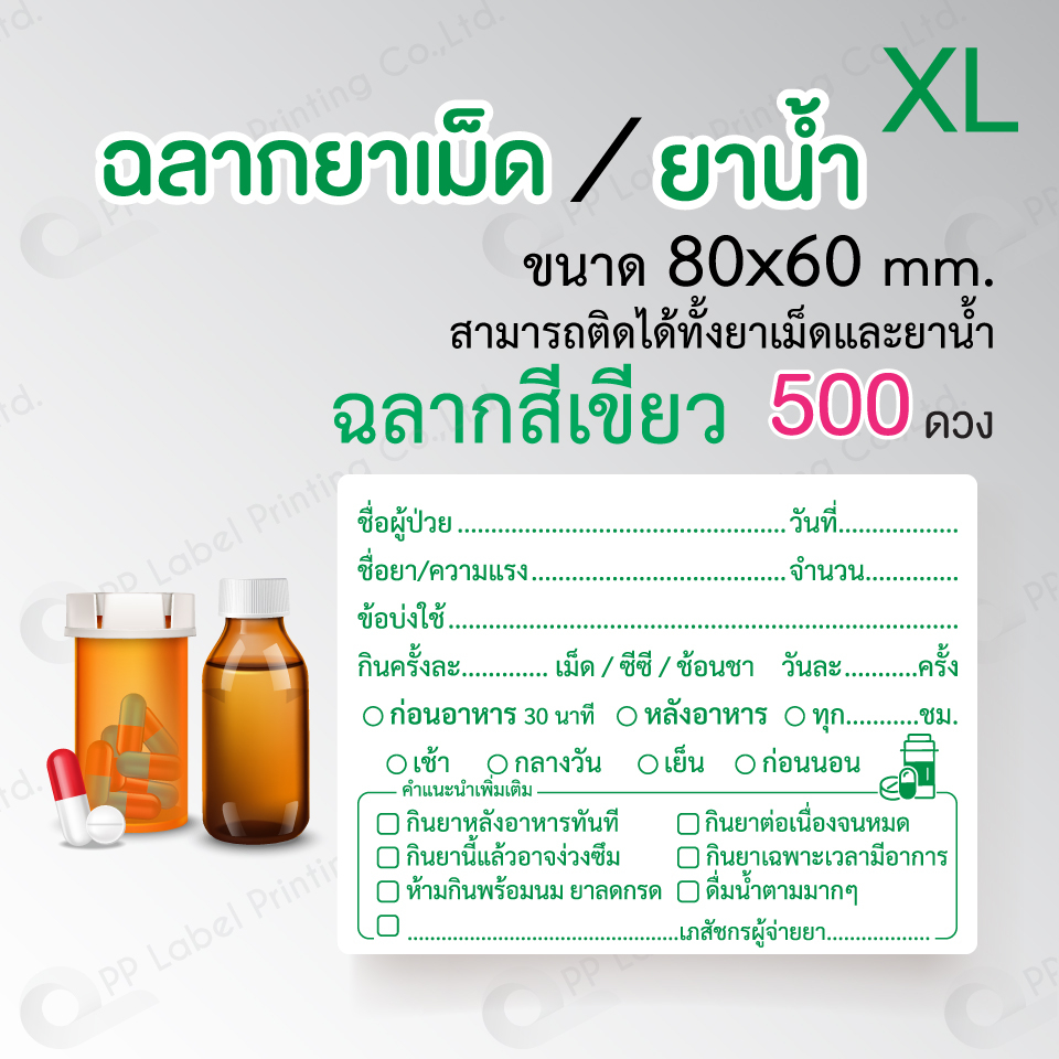 ขนาดตัวเลือกรูปแบบสติ๊กเกอร์ ฉลากยาน้ำ : ขนาด 70x45 mm. จำนวน 500 ดวง/ห่อ (ติดเฉพาะยาน้ำ) ฉลากยาเม็ด XL : ขนาด 80x60 mm. จำนวน 500 ดวง/ห่อ (ติดเฉพาะยาเม็ด) ยาเม็ด/น้ำ เขียว L : ขนาด 75x50 mm. จำนวน 500 ดวง/ห่อ (ติดได้ทั้งยาเม็ดและยาน้ำ) ยาเม็ด/น้ำ ฟ้า L : ขนาด 75x50 mm. จำนวน 500 ดวง/ห่อ