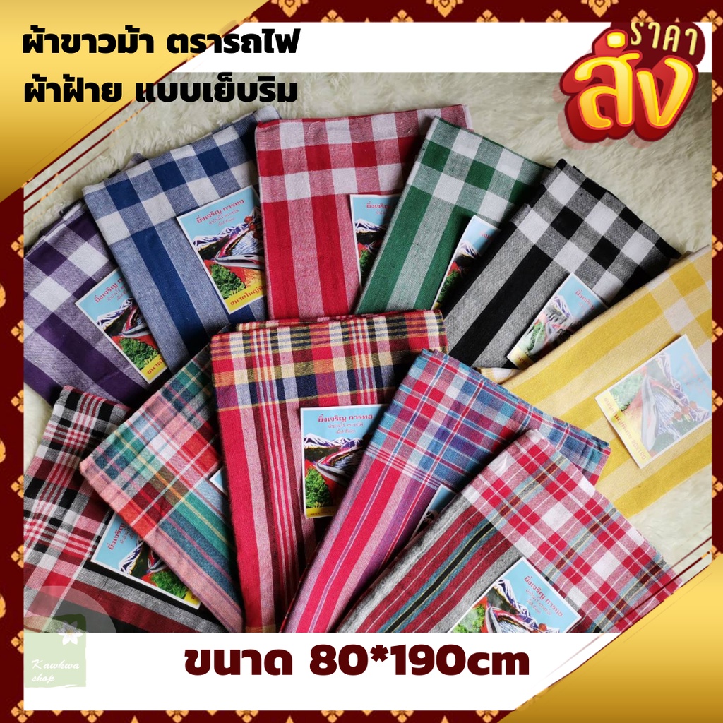 ผ้าขาวม้าบ้านไร่ ตรารถไฟสินค้าสั่งตรงจากโรงงาน การันตีคุณภาพลาย ผ้าเป็นพื้นเมืองประยุกต์ทันสมัยกว่าผ้าขาวม้าท้องถิ่นเย็บริมเรียบร้อยแล้ว ซึมซับน้ำได้ดีมากเนื้อผ้าดี สีไม่ตก ยิ่งซักผ้ายิ่งนิ่มหนา ทนทาน มีหลากสี *****ขนาด 80×190 cm * สามารถใช้เป็นของฝาก งานบุญ งานขาวดำ งานแต่ง งานเกษ