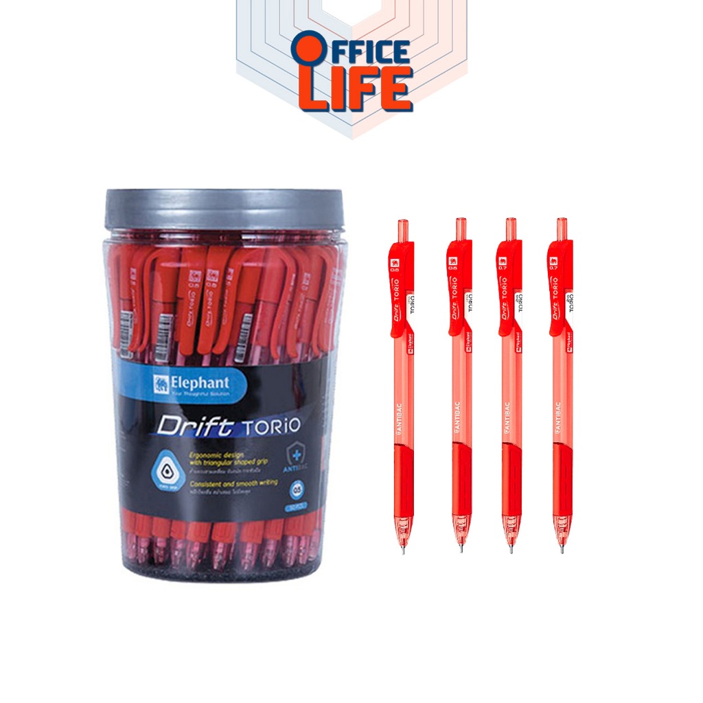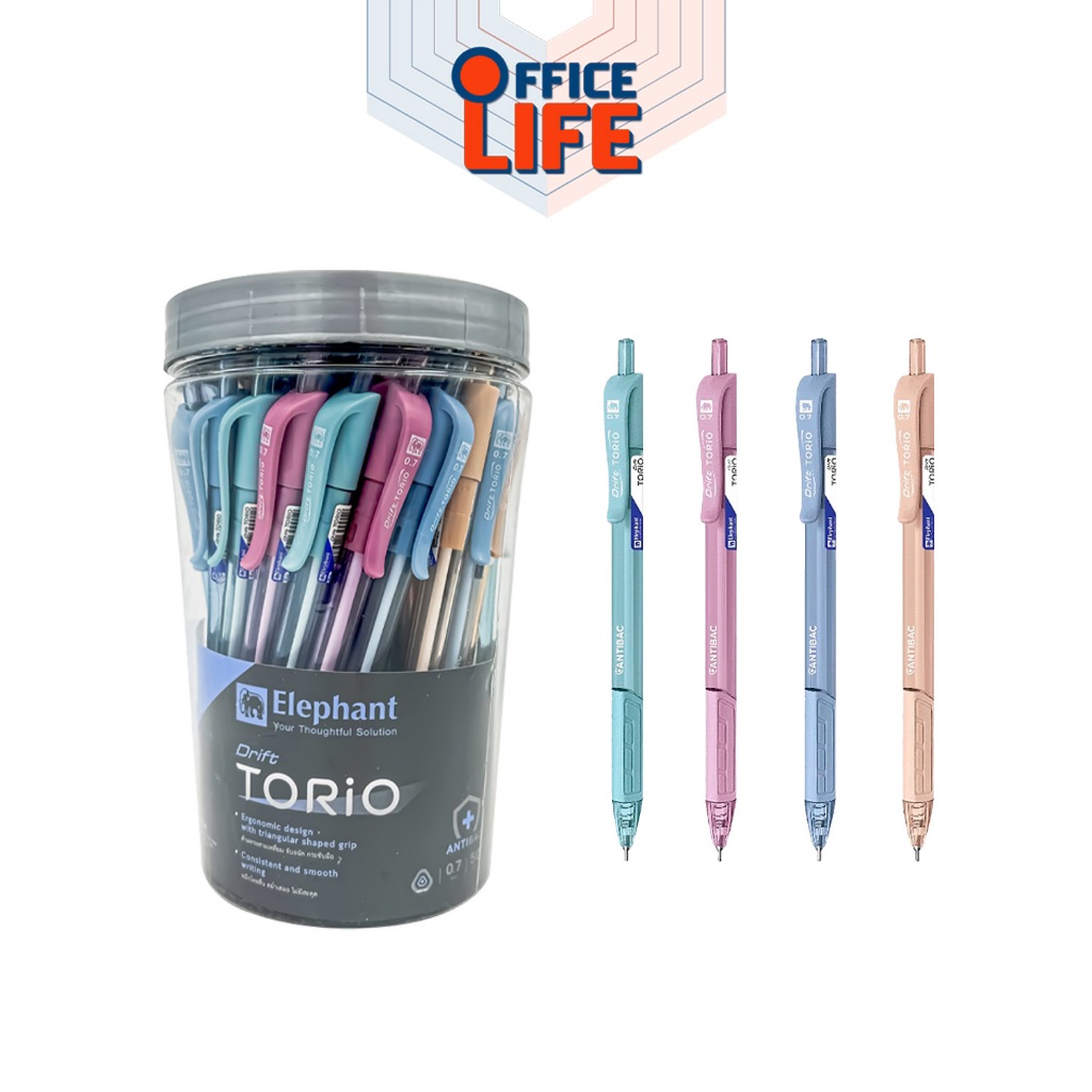 Elephant ปากกาลูกลื่น ปากกา รุ่น Drift Torio ตราช้าง ปากกาดริฟท์ โทริโอะ (Drift Torio) 0.5มม. หมึกสีน้ำเงิน (50 ด้าม) ด้ามคละสี หัวปากกาผลิตจากนิเกิล-ซิลเวอร์ แข็งแรงทนทาน ควบคุมการไหลของน้ำหมึกได้ดี หมึกเข้ม เส้นคมชัด ไม่เยิ้ม ดีไซน์ตัวด้ามโปร่งสีสันสดใส ปุ่มกดและคลิปสีเดียวกับด้าม - ปากกาลู