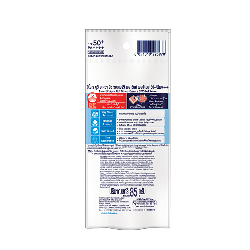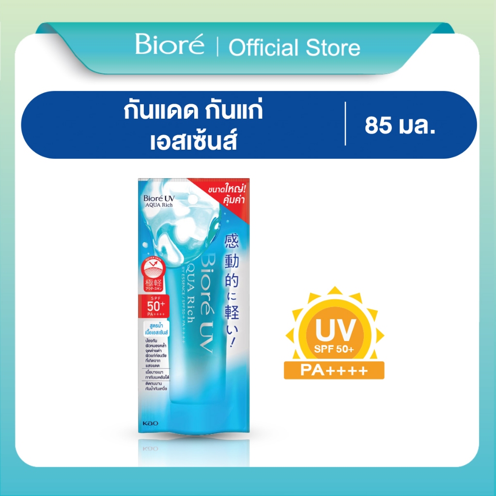 กันแดดบิโอเร ยูวี อะควา ริช วอเตอร์รี่ เอสเซ้นส์ เอสพีเอฟ50+ พีเอ++++ 85 กรัม ไซส์ใหญ่คุ้มค่า Biore UV Aqua Rich Watery Essence SPF50+ PA++++ 85g โฉมใหม่! กันแดด กันแก่ ครั้งแรกของโลก สูตร Micro Defense นวัตกรรมขั้นสุดจากญี่ปุ่น อนุภาคเล็กปกปิดแดดมิดชิดได้สมบูรณ์แบบที่สุด ปกป้องแม้ร่องผิวลึก
