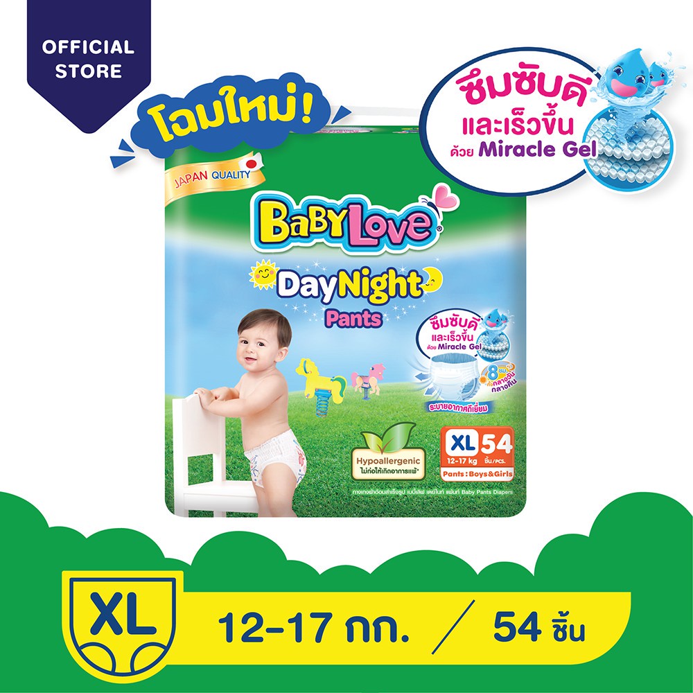 ... ้งรอยแดงบนผิวลูกน้อย ด้วย Comfy Elastic fit - ลวดลายสัตว์ น่ารัก สดใส พร้อมคำศัพท์ภาษาอังกฤษ - พร้อมผลทดสอบว่าไม่ก่อให้เกิดอาการแพ้ New! BabyLove Day&Night – powered by our “Miracle Gel” for more effective and faster absoption, no worry about leakage Baby stay fresh Day+Night for up to 8 hrs. Clinically proven Hypoallergenic test to protect your baby’s sensitive skin from irritation. BabyLove DayNight Pants Mega Pack Size S (78 Pcs.) BabyLove DayNight Pants Mega Pack Size M (74 Pcs.) BabyLove DayNight Pants Mega Pack Size L (62 Pcs.) BabyLove DayNight Pants Mega Pack Size XL (54 Pcs.) BabyLove DayNight Pants Mega Pack Size XXL (48 Pcs.s) Size mega ส่วนประกอบ แผ่นใยสังเคราะห์ • โพลิเมอร์ • เยื่อกระดาษ • โพลิเอทิลีน • โพลิยูลิเทน • กาว อายุการเก็บรักษา 36เดือนนับจากวันที่ผลิต