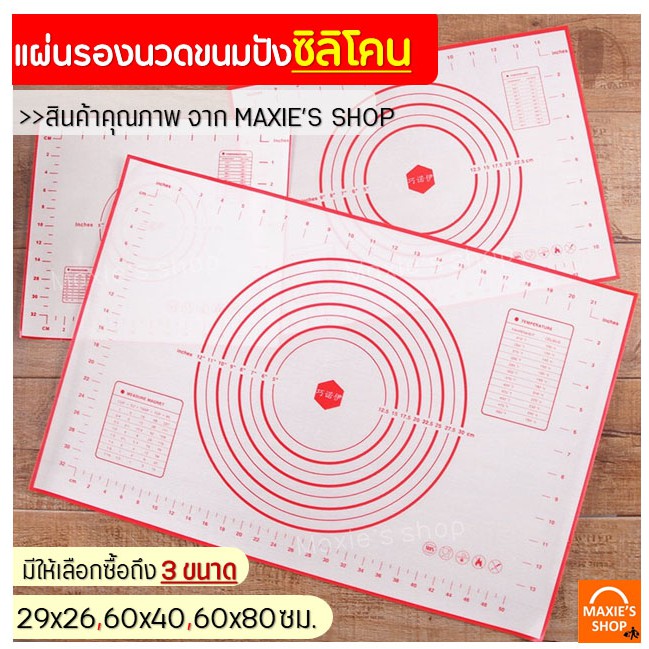 แผ่นซิลิโคนนวดขนมปัง MAXIE Premium Plus (มีให้เลือกถึง 3 ขนาด ได้แก่ 29 * 26 ซม., 40*60 ซม., 60*80 ซม.) อุณหภูมิที่รองรับได้: -40ถึง230องศาเซลเซียส จุดเด่น:แผ่นรองอบวัสดุซิลิโคนที่ผสมใยไฟเบอร์กลาสคุณภาพดี ช่วยให้มีคุณสมบัติอ่อนนุ่ม น้ำหนักเบาและทนทานกว่าแผ่นรองนวดทั่วๆไป พร้อมสเกลไม้บรรทัดรอบด้า