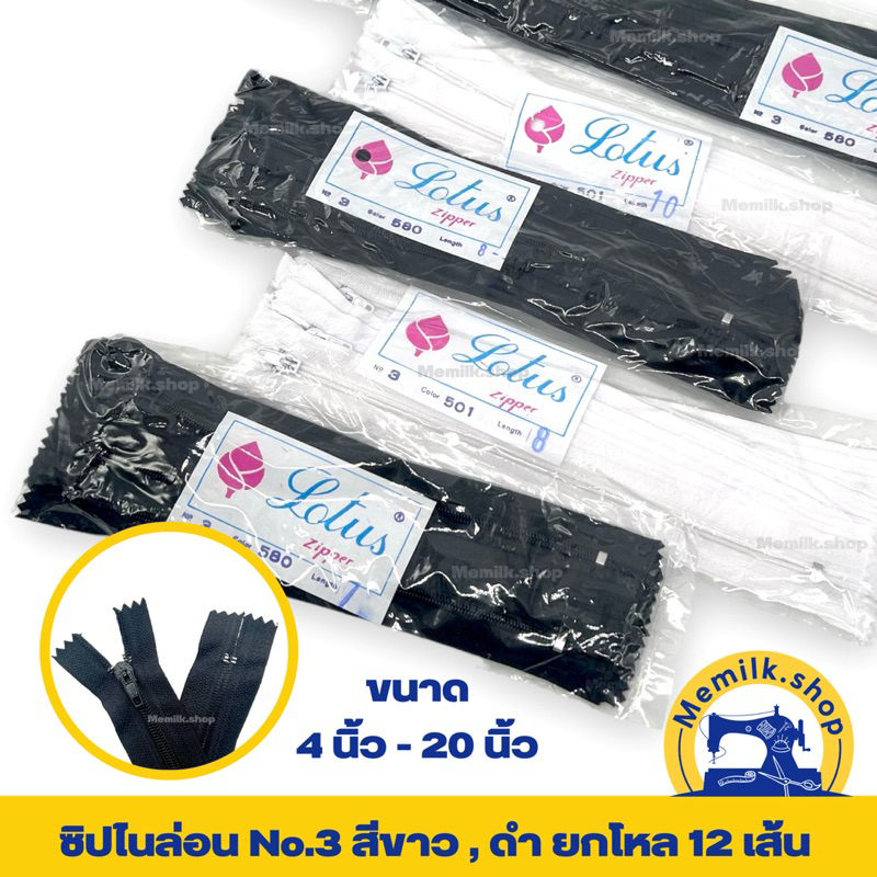 ซิปไนล่อนเบอร์ 3 สีขาว - สีดำ เเพคยกโหล 12 เส้น ขนาด 5 นิ้ว - 20 นิ้ว ( ไม่ใช่ ซิปซ่อน นะคะ )
