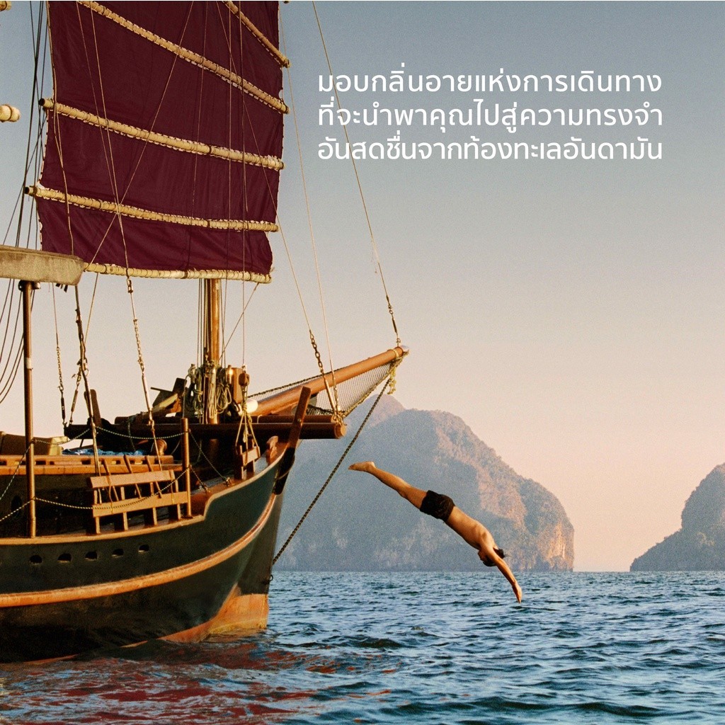 Andaman Sails สัมผัสกลิ่นหอมแนว Green Citrus ที่ผสมผสานระหว่าง Bergamot, Green Tea, Nutmeg และ Sandalwood พร้อมมอบความรู้สึกสดชื่นและสดใส ชวนให้นึกถึงความทรงจำอันล้ำค่าในช่วงเวลาแสนสงบสุข ณ ท้องทะเลอันดามัน ที่จะสร้างสรรค์แรงบันดาลใจสำหรับการเดินทางครั้งใหม่ให้กับคุณ Eternal Sunshine ผยกลิ่นหอม