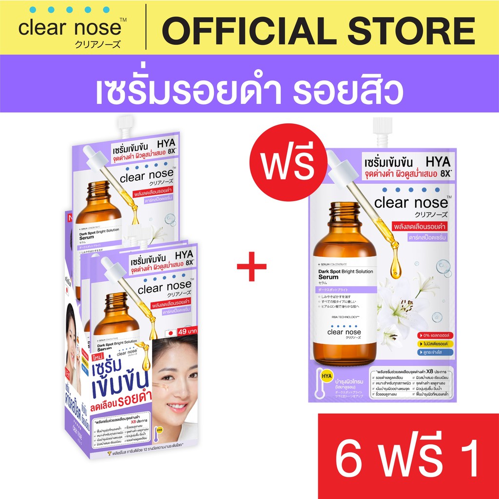 **Clear Nose Official ส่งตรงจากบริษัทฯ มั่นใจ 100%** ใหม่!! เคลียร์โนส ดาร์ค สป็อต ไบรท์ เซรั่ม 7กรัม พิเศษ ซื้อ6แถม1 (กด1ครั้งได้ 7 ซอง) Clear Nose Dark Spot Bright Serum 7g สินค้าเป็นซองใหม่ ไม่มีดิสเพลย์ เซรั่มที่ช่วยลดเลือนรอยดำให้ดูจางลง ฟื้นบำรุงผิวที่หมองคล้ำให้แลดูกระจ่างใส สูตรเข