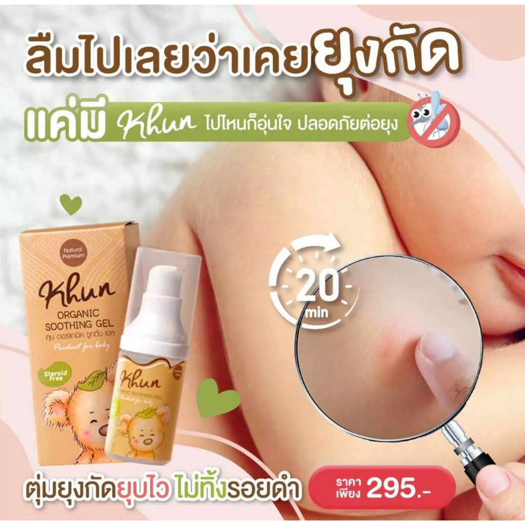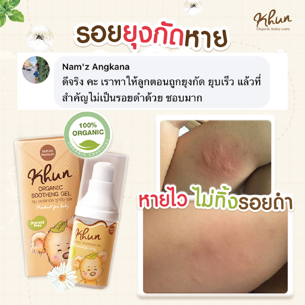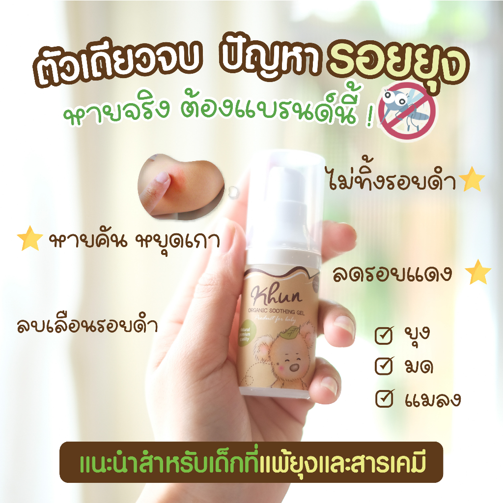 ... ับสภาพผิวเนียนใส Eucalyptus Oil ให้กลิ่นหอมและความเย็นสดชื่นแก่ผิว บรรเทาอาการคัน . จุดเด่น - item เดียวอยู่ ทั้ง ลดคัน + บวมแดง + ลดรอยดำ ไม่ทิ้งแผลให้ขาลาย - ทาปุป หายคันปั๊บ น้องหยุดเกา ไม่เกิดการอักเสบเพิ่มขึ้น - สมุนไพรจากธรรมชาติ แทนการใช้สารเคมีหรือสเตีนรอยด์ √ No Steroid √ No Paraben √ No Alcohol √ No EDTA √ No Colorant √ No artificial fragrance √ No animal testing √ Non GMOs คำแนะนำ : ใช้ได้ตั่งแต่เด็กแรกเกิด ผู้ใหญ่ และผู้ที่มีผิวบอบบางแพ้ง่าย 2. KHUN Mozzie Mineral Spray สเปรย์น้ำแร่บำรุงผิวสูตรไล่ยุงสำหรับเด็กหรือผู้มีผิวแพ้ง่าย ปราศจากสาร DEET และ แอลกอฮอล์ น้ำแร่ซึมซาบเร็วไม่เหนียวเหนอะหนะ น้ำแร่อุดมไปด้วยแร่ธาตุต่างๆช่วยทำให้ผิวชุ่มชื้น ผสานด้วยกลิ่นหอมจากน้ำมันหอมระเหยสกัดจากธรรมชาติหลายชนิดเพื่อคุณประโยชน์และประสิทธิภาพการไล่ยุง ข้อมูลทั่วไป -สเปรย์น้ำแร่บำรุงผิว สูตรไล่ยุง -ปราศจากสาร DEET และ แอลกอฮอล์ -น้ำแร่ซึมซาบเร็ว ไม่เหนียวเหนอะหนะ -อุดมไปด้วยแร่ธาตุต่างๆช่วยทำให้ผิวชุ่มชื้น -ผสานด้วยกลิ่นหอมจากน้ำมันหอมระเหยสกัดจากธรรมชาติหลายชนิด -เพื่อคุณประโยชน์และประสิทธิภาพการไล่ยุง -เหมาะสำหรับเด็กหรือผู้มีผิวแพ้ง่าย คำแนะนำ : ฉีดที่ร่างกายหรือเสื้อผ้า สำหรับเด็ก 1 เดือนขึ้นไป #KhunOrganic #คุนออร์แกนิค #กันยุงเด็ก #สเปรย์กันยุง #ป้องกันยุงเด็ก #โลชั่นกันยุงเด็ก #ปราศจากสาร Deet 3. "หอมมาก ชอบมากก ลูกอยากแปรงฟันอีก 😍" #khunยาสีฟันเด็กกลืนได้ ให้การแปรงฟันเป็นประสบการณ์ที่ดีของลูกน้อย ❤ด้วย... #Khunยาสีฟันออร์แกนิคกลิ่นสตรอเบอรี่ Premium Food Grade เผลอกลืนได้ นำเข้าส่วนผสมจากประเทศญี่ปุ่น 🇯🇵 นวัตกรรมเพื่อ "ป้องกันฟันผุ"จากสารสกัดมันฝรั่ง🥔 แทนการใช้สารฟลูออไรด์ ส่วนผสม Premium Oral Grade ช่วยดูแลสุขภาพฟันและช่องปากลูกน้อยอย่างมีประสิทธิภาพด้วยส่วนผสมจาก Clove Oil ช่วยยับยั้งแบคทีเรียและบำรุงรากฟันร่วมกับ Organic Aloe Vera ซึ่งมีสรรพคุณช่วยบำรุงเหงือกและช่วยให้ปากชุ่มชื้น ไม่แห้งระคายเคืองหลังแปรงฟัน กลิ่นหอมของสตรอเบอรีช่วยให้การแปรงฟันของลูกน้อยเป็นประสบการณ์ที่ดีและเพลิดเพลิน☺️ สำหรับเด็กอายุ 0-6 ปี #ทำไมคุณแม่จึงเลือกยาสีฟัน #khunorganic ? ✅ กลืนได้ ไม่อันตราย ✅ เลือกส่วนผสม Premium Food grade มั่นใจคุณภาพ ✅ ป้องกันฟันผุ นวัตกรรมจากประเทศญี่ปุ่น 🇯🇵 ✅ ใช้ได้ตั้งแต่เด็กฟันซี่แรก ✅ ส่วนผสมจากธรรมชาติ 🌿 ✅ กลิ่มหอม ลูกชอบมากก ✅ ปราศจากน้ำตาล "ยอมให้แปรงฟันสบายเลย ไม่งอแง ลูกไม่อ้วกหลังแปรงฟันเสร็จ เหมือนบางอัน" "กลิ่มหอม ใช้ดีมากค่ะ" "ลูกชอบมาก ขอแปรงฟันทุกวันสามเวลา 😂" "ใช้ดีค่ะ เด็กที่บ้านชอบมากๆค่ะ" "น้องชอบค่ะ ใช้ดี ใช้ตลอด น้องไม่แพ้" "บ้านนี้ใช้ค