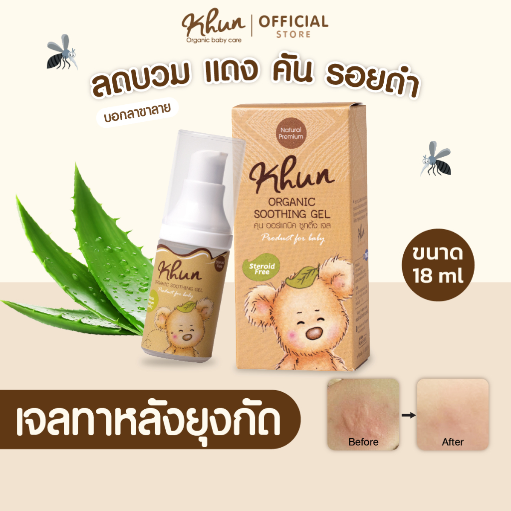 1. เจลทาหลังยุงหรือแมลงกัดต่อย ขนาด 18 ml. (สินค้าขายดี!) ส่วนผสมจากธรรมชาติ ปราศจากสเตรอยด์และสารเคมีต่างๆ ใช้เพื่อบรรเทาอาการคัน บวม แดงและลบเลือนรอยดำในหนึ่งเดียว ด้วยเนื้อเจลบางเบาซึมซาบเร็ว อุดมไปด้วยคุณประโยชน์จากสารสกัดธรรมชาติ ทั้งอโลเวร่าช่วยบรรเทาอาการระคายเคืองและบำรุงผิว วิตามินบีช่วยปร
