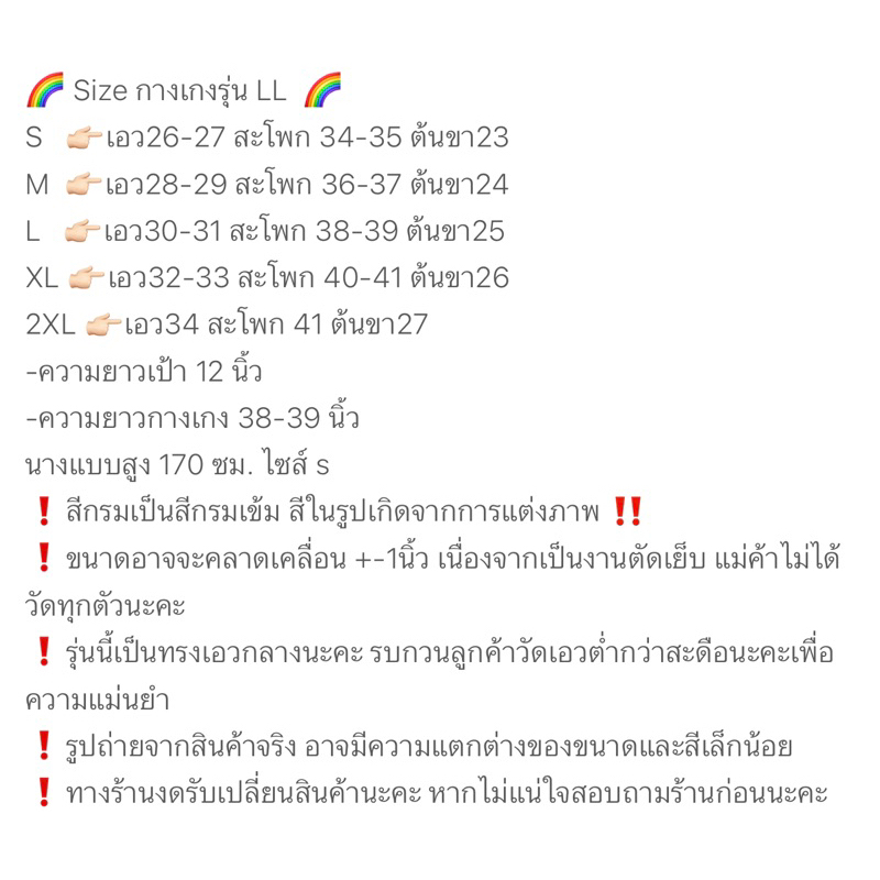 ... ป็นผ้าอยู่ทรง มีน้ำหนักในตัว ไม่หนาไม่บางกำลังดีคะ(ไม่เห็นชั้นในนะคะสาวๆ) ผ้ารุ่นนี้เนื้อละเอียด ไม่รีดก็สวยได้คะ เหมาะกับเวลาเร่งรีบมากๆๆ 🌈 ดีเทลรุ่น LL 🌈 ❣️ตะขอหน้า ❣️กระเป๋า2ข้าง 🌈 Size กางเกงรุ่น LL 🌈 S 👉🏻เอว26-27 สะโพก 34-35 ต้นขา23 M 👉🏻เอว28-29 สะโพก 36-37 ต้นขา24 L 👉🏻เอว30-31 สะโพก 38-39 ต้นขา25 XL 👉🏻เอว32-33 สะโพก 40-41 ต้นขา26 2XL 👉🏻เอว34 สะโพก 41 ต้นขา27 -ความยาวเป้า 12 นิ้ว -ความยาวกางเกง 38-39 นิ้ว นางแบบสูง 170 ซม. ไซส์ s ❗️สีกรมเป็นสีกรมเข้ม สีในรูปเกิดจากการแต่งภาพ ‼️ ❗️ขนาดอาจจะคลาดเคลื่อน +-1นิ้ว เนื่องจากเป็นงานตัดเย็บ แม่ค้าไม่ได้วัดทุกตัวนะคะ ❗️รุ่นนี้เป็นทรงเอวกลางนะคะ รบกวนลูกค้าวัดเอวต่ำกว่าสะดือนะคะเพื่อความแม่นยำ ❗️รูปถ่ายจากสินค้าจริง อาจมีความแตกต่างของขนาดและสีเล็กน้อย ❗️ทางร้านงดรับเปลี่ยนสินค้านะคะ หากไม่แน่ใจสอบถามร้านก่อนนะคะ 🚛การจัดส่งสินค้า🚛 ทางร้านใช้ขนส่ง J&T จัดส่งวันจันทร์-วันเสาร์นะคะ ตัดรอบส่งก่อน 08.00น. (ตามคิวออเดอร์ในแต่ละวัน) ระยะเวลารับสินค้าประมาณ1-3 วันแล้วแต่พื้นที่นะคะ ❗️หากสินค้าไม่ตรงตามออร์เดอร์ ผิดไซส์ ผิดสี แจ้งทางร้านหลังได้รับสินค้าภายใน 2 วัน หรือเสียหายจากการขนส่ง แจ้งทางแชทนะคะ แม่ค้าดูแลให้ แต่ถ้ารีวิวแล้วถือว่ายอมรับสินค้านะคะ ทางร้านรับผิดชอบค่าส่ง(ไปรษณีย์ไทยเฉพาะลงทะเบียน)สูงสุด30บาท ❗️ขออนุญาตไม่รับเปลี่ยนที่อยู่ รุ่นกางเกง ไซส์ สีทางแชทนะคะ ❗️สอบถามเพิ่มเติมทางข้อความได้ตลอด ร้านจะพยายามตอบกลับให้เร็วที่สุดคะ 🚫🚫ข้อมูลและรูปประกอบทั้งหมดเป็นทรัพย์สินทางร้านไม่อนุญาตให้นำไปใช้🚫🚫