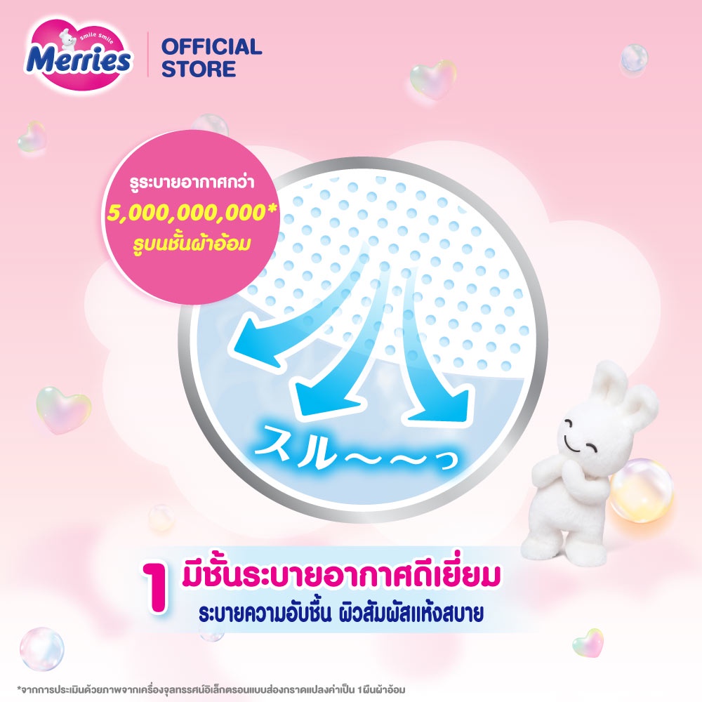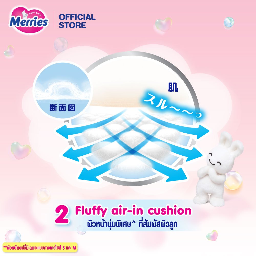 ... เยี่ยม ผิวลูกยังคงแห้งสบายแม้เคลื่อนไหวมาก คุณสมบัติ -ชั้นระบายอากาศดีเยี่ยมรอบตัว พร้อมรูระบายอากาศกว่า 5 พันล้านรูระบายอากาศบนชั้นผ้าอ้อม -ช่องระบายอากาศรอบเอว ช่วยระบายความอับชื้นโดยตรง ผ่านช่องระบายอากาศรอบเอวและผิวลูกน้อย -Fluffy air-in cushion ผิวหน้านุ่มพิเศษ* ที่สัมผัสผิวลูก พัฒนาผิวหน้าเวฟวี่**ให้นุ่มยิ่งขึ้น อากาศไหลผ่านทั่วผิวลูกน้อย จึงแห้งสบายทั้งวัน แม้เคลื่อนไหวมาก - ขอบเอวสุดนุ่มยืดหยุ่นแนบสรีระและพอดีตัว ใส่สบาย ไม่รัดแน่นจนเกินไป ให้ลูกน้อยเคลื่อนไหวได้สนุกสนาน นุ่มสบายไม่เลื่อนหลุด - ซึมซับได้ดีเยี่ยม แห้งสบาย ดูดซับและกักเก็บปัสสาวะอย่างรวดเร็ว แม้ปริมาณมากป้องกันปัญหารั่วซึมอย่างมีประสิทธิภาพ - แถบวัดความเปียกชื้น^ ช่วยเตือนคุณแม่ โดยแถบจะเปลี่ยนเป็นสีเขียวเข้มเมื่อถึงเวลาเปลี่ยนผ้าอ้อมให้ลูกน้อย ^แถบวัดความเปียกชื้นอาจเปลี่ยนเป็นสีเขียวก่อนใช้ หากผลิตภัณฑ์ถูกเก็บในที่ร้อนหรือชื้น การเปลี่ยนสีก่อนใช้จะไม่ส่งผลกระทบต่อคุณภาพของผ้าอ้อม ยกเว่นขนาด XXL **มีเฉพาะแบบกางเกงไซส์ S และ M เพื่อผิวที่บอบบางของลูกน้อย *เมื่อเทียบกับเมอร์รี่ส์รุ่นเก่า *ผลโหวตจากแม่ญี่ปุ่น แนะนำให้ท่านอื่นใช้ หลังใช้งานจริง Size S 62pcs. M 52pcs. L 44pcs. XL 38pcs. XXL 26pcs. ส่วนประกอบ Top Sheet,Absorbent Pad,Back Sheet , Elastic , Hot Melt Adhesive อายุการเก็บรักษา 36 เดือนนับจากวันที่ผลิต