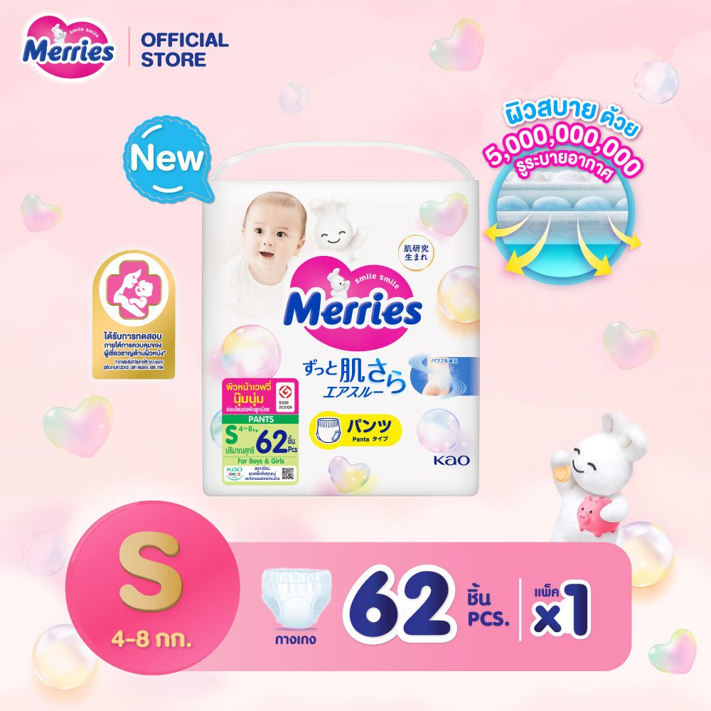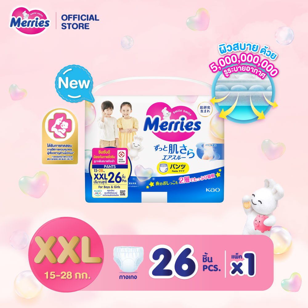 โฉมใหม่!! Merries Japan Pants (ผ้าอ้อมเด็กเมอร์รี่ส์แบบกางเกง) เมอร์รี่ส์ No.1 Brand ที่แม่ญี่ปุ่นแนะนำ* เป็นผ้าอ้อมที่มีคุณภาพที่ได้รับการทดสอบภายใต้การควบคุมของผู้เชี่ยวชาญด้านผิวหนัง ได้รับรางวัลการออกแบบยอดเยี่ยม Good Design Award จากญี่ปุ่น เมอร์รี่ส์ ได้พัฒนาผิวหน้าให้นุ่มพิเศษ ซึบซับดี