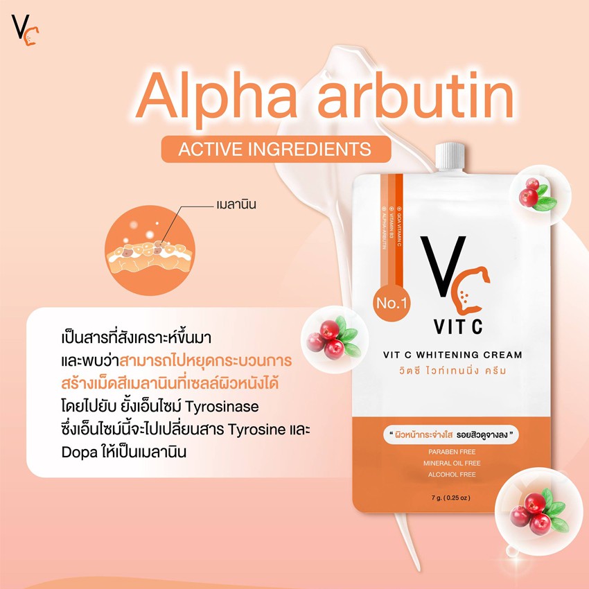 VC. Vit C Whitening Cream วิตซี ไวท์เทนนิ่ง ครีม (7 กรัม x 10 ซอง) วิธีใช้ : ใช้ทาบำรุงผิวหน้าเป็นประจำ เช้า-เย็น ปริมาณสุทธิ : 7 กรัม เลขที่ใบรับแจ้ง 11-1-6300053959