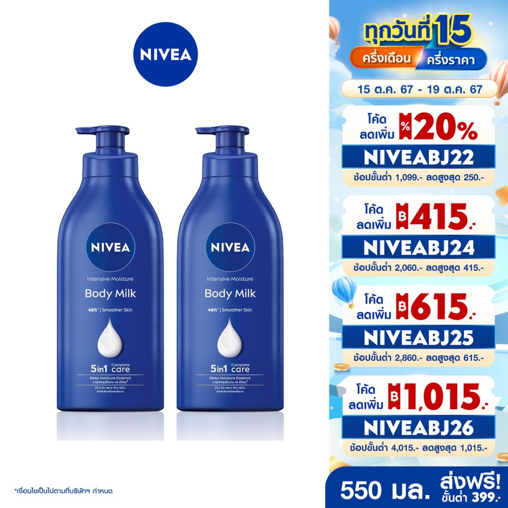... วนีเวีย บอดี้ มิลค์ โลชั่นเนื้อน้ำนม บางเบาซึมซาบเข้าสู่ผิวฟื้นฟูผิวแห้งเสีย ให้เนียนนุ่ม ด้วยเทคโนโลยี Deep Moisture Essence* เอสเซนส์ให้ความชุ่มชื้นล้ำลึก^ ให้สัมผัสผิวเนียนสมูทยาวนาน 48 ชม.** แตกต่างด้วย: - ผสานวิตามินอี 50 เท่า^^ ฟื้นบำรุงผิวแห้งกร้านให้กลับนุ่มชุ่มชื้นอิ่มน้ำทันที - อโวคาโดออยล์เข้มข้น ปกป้องผิวไม่ให้สูญเสียความชุ่มชื้นระหว่างวัน ช่วยเก็บล็อคความชุ่มชื้นให้คงอยู่บนผิวได้ยาวนาน - สูตร PH Balance ไม่ทำร้ายสมดุลผิวตามธรรมชาติ พัฒนาจากกว่า 100 ปี แห่งความเชี่ยวชาญในการดูแลผิวของนีเวีย ผ่านการทดสอบจากผู้เชี่ยวชาญด้านผิวพรรณแล้ว ให้ผลลัพธ์ผิวสุขภาพดี 10 ประการ ^ผิวชั้นอีพิเดอร์มิส ^^เทียบปริมาณรวมของวิตามินอีทั้งหมดในผลิตภัณฑ์นีเวียโลชั่นสูตรอื่น *Glyceryl Glucoside และ Glycerin **ผลการทดสอบในอาสาสมัครหญิงจำนวน 33 คน โดย Skin Investigation and Technology, เยอรมนี, ต.ค.2560 ประโยชน์ • วิตามินอี 50 เท่า** ฟื้นบำรุงผิวแห้งกร้านให้กลับนุ่มชุ่มชื้นอิ่มน้ำทันที • น้ำมันสกัดจากอโวคาโด คุณค่าบำรุงผิวชั้นดีจากธรรมชาติ • สูตร pH Balance เหมาะสมกับผิว ไม่ทำร้ายสมดุลผิวตามธรรมชาติ • ผ่านการทดสอบจากผู้เชี่ยวชาญด้านผิวพรรณแล้ว คำเตือน: 1.อ่านวิธีใช้ให้ละเอียดและปฏิบัติตามอย่างเคร่งครัด 2.หากใช้แล้วมีความผิดปกติใดๆ เกิดขึ้น ต้องหยุดใช้และปรึกษาแพทย์