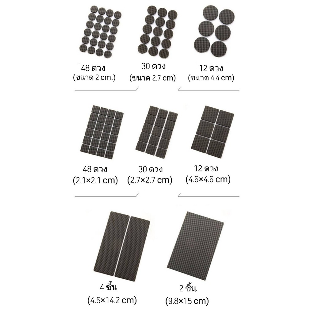 ... ี 15 ชิ้น 3. แบบกลม ขนาด 4.4 ซม. 1 แผ่นมี 6 ชิ้น 4. แบบสี่เหลี่ยม ขนาด 2.1x2.1 ซม. 1 แผ่นมี 24 ชิ้น 5. แบบสี่เหลี่ยม ขนาด 2.7x2.7 ซม. 1 แผ่นมี 15 ชิ้น 6. แบบสี่เหลี่ยม ขนาด 4.6x4.6 ซม. 1 แผ่นมี 6 ชิ้น 7. แบบสี่เหลี่ยม ขนาด 4.5*14.2 ซม. 1 แผ่นมี 2 ชิ้น 8. แบบสี่เหลี่ยม ขนาด 9.8*15 ซม. 1 แผ่นมี 1 ชิ้น (สามารถตัดขนาดได้เองตามความต้องการ) มีให้เลือก 2 แบบ คือ - แพ็ค 1 แผ่น - แพ็ค 2 แผ่น 💠💠💠💠💠💠💠💠💠💠💠💠💠💠💠💠💠💠💠 🚚 ร้านของเราเข้าร่วมโปรแกรมส่งฟรี เพื่อสิทธิประโยชน์ของลูกค้า 📌📌 อย่าลืม!! เก็บและเลือกใช้โค้ดส่งฟรี ก่อนชำระเงิน 📌📌 #ที่รองขาเก้าอี้ #แผ่นรองขาเก้าอี้ #แผ่นรองขาโต๊ะ #แผ่นรองใต้ขาโต๊ะ
