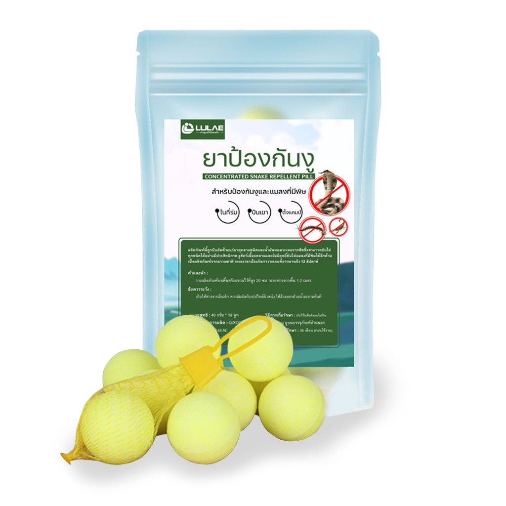 LULAE ช่วยให้ปลอดภัย ยาป้องกันงู ยาไล่งู แมลงมีพิษต่างๆ ช่วยป้องกันภายในตัวบ้าน ช่วยปกป้องการตั้งแคมป์ จากงูและแมลงมีพิษ - แพ็คละ 10 ลูก - น้ำหนักสุทธิ 40 กรัม - อายุการใช้งาน 12 สัปดาห์ - การใช้งาน วางที่พื้นหรือแขวนด้วยความสูง 10-20 ซม.จากพื้น ห่างกัน 1-2 เมตร - ผลิตจากแร่ธาตุหลายชนิดที่ง